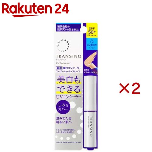 お店TOP>トランシーノ 薬用UVコンシーラー (2.5g×2セット)商品区分:医薬部外品【トランシーノ 薬用UVコンシーラーの商品詳細】しみを隠しながら美白ケアが叶うUVコンシーラー●SPF50+、PA++++の最強UVカット※1。 UV耐水性☆☆。 ●美白・肌荒れ防止有効成分「トラネキサム酸」、うるおい成分「角質層リファイン成分※2」配合。 さらに「日中ダメージ着目成分※3」配合で、紫外線やPM2.5による肌ダメージに着目しています。 ●「滞留じみ着目成分※4」配合、しみ部分にぴったりフィットする「しみラップ処方」、しみの境目を目立たなくする「境目ぼかしパウダー」など、しみ部分を考えたコンシーラーです。 ●なじみやすいマルチベージュで、しみ・色ムラを自然にカバー。 使いやすいスティックタイプ。 ●汗・水に強い処方で、ヨレにくいカバー力。 ●スーパーウォータープルーフ。 ※1 国内基準最高レベル※2 トレハロース、ポリメタクリロイルオキシエチルホスホリルコリン液※3 ボタンエキス、コウキエキス-2、オウゴンエキス(保湿)※4 モモ葉エキス(保湿)美白:メラニンの生成を抑え、しみ・そばかすを防ぐ【販売名】DSコンシーラーa【使用方法】・スティックを5mmほど繰り出し気になる部分にのばします。 ・塗った部分の境目をたたくようにぼかします。 目の下など広い範囲にもお使い頂けます。 ・パウダーファンデーションを使用される場合はファンデーションの前に、リキッドタイプ、クリームタイプのファンデーションの場合はファンデーションの後にご使用ください。 【成分】有効成分:トラネキサム酸その他の成分:トレハロース、ポリメタクリロイルオキシエチルホスホリルコリン液、コウキエキス-2、ボタンエキス、オウゴンエキス、モモ葉エキス、α-オレフィンオリゴマー、酸化チタン、トリオクタン酸グリセリル、エチルヘキサン酸セチル、微粒子酸化チタン、マイクロクリスタリンワックス、ポリエチレンワックス、N-ラウロイル-L-グルタミン酸ジ(フィトステリル・ベヘニル・2-オクチルドデシル)、無水ケイ酸、パラフィン、黄酸化鉄、カオリン、架橋ポリスチレン、セスキイソステアリン酸ソルビタン、水酸化Al、グリセリン脂肪酸エステル、ステアリン酸、スクワラン、BG、ジメチコン、ビタミンE、水、エタノール、ベンガラ、黒酸化鉄、パラメトキシケイ皮酸オクチル【注意事項】・ご使用法・ご注意をよく読んでからご使用下さい。 ・肌に異常が生じていないかよく注意してご使用下さい。 使用中に、赤み、はれ、かゆみ、刺激、色抜け(白斑等)や黒ずみ等の異常があらわれた場合、使用した肌に直射日光があたって同様の異常があらわれた場合は、使用を中止し、皮ふ科医にご相談下さい。 使用を続けると症状を悪化させることがあります。 ・傷やはれもの、湿疹等、異常のある部位には使用しないで下さい。 ・肌の弱い方は腕の内側の皮ふの弱い部分に少量を塗布し、赤みやかゆみが起きないことをご確認ください。 ・目に入ったときは、直ちに洗い流してください。 ・乳幼児の手の届かない所に保管して下さい。 ・極端に高温又は低温の所、直射日光の当たる所には保管しないで下さい。 ・使用後は必ずキャップをしめて下さい。 ・開封後は早めにご使用ください。 ・SPF表示(及びPA表示)は商品選択の目安です。 効果的な紫外線防止のために、十分な量をムラなくのばしてお使いいただき、使用中はこまめに塗り直して下さい。 また汗やタオルなどで落ちてしまった場合もこまめに塗り直して下さい。 ・おしろいやファンデーションなどが、金属製眼鏡フレームや指輪などとこすれて黒くみえることがありますが、お肌には影響ありません。 【原産国】日本【ブランド】トランシーノ【発売元、製造元、輸入元又は販売元】第一三共ヘルスケア※説明文は単品の内容です。 リニューアルに伴い、パッケージ・内容等予告なく変更する場合がございます。 予めご了承ください。 ・単品JAN:4987107635457第一三共ヘルスケア東京都中央区日本橋3-14-100120-337-336広告文責:楽天グループ株式会社電話:050-5306-1825 トランシーノ 薬用UVコンシーラー(2.5g×2セット)【トランシーノ】 5,720 ~
