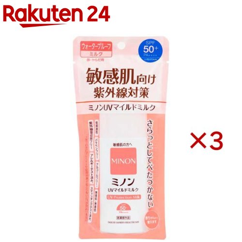 お店TOP>化粧品>UV・日焼け止め>日焼け止め>日焼け止めミルク>ミノン UVマイルドミルク (80ml×3セット)商品区分:医薬部外品【ミノン UVマイルドミルクの商品詳細】●SPF50+ PA++++/顔・からだ用/ウォータープルーフ/「UV耐水性★★」(UV 耐水性は外部から付着する水分に対する日やけ防止効果の強さを示す指標 です)●小さなお子様から使えます/化粧下地としても/さらっとしてべたつかないミルク●肌を守りながら肌あれを防ぐ・3種のバリア機能サポート成分:SPL(Self Protection Lipid)・アミノ酸系セラミド類似成分・バイオグリコーゲン・肌あれを防ぐ:グりチルリチン酸2K(有効成分)●やさしさを考えたこだわり処方・紫外線吸収剤フリー・パラベンフリー・アルコールフリー・無香料・無着色・アレルギーテスト済み*・スティンギングテスト済み**全ての方にアレルギーや皮膚刺激が起こらないわけではありません【販売名】DSUVマイルドミルク【使用方法】・適量を少量ずつ、肌にムラなくなじませます。 使用量が少ないと、充分な日焼け止め効果が得られません。 効果を保つために、汗を拭いた後などは、こまめに塗り直して下さい。 ・落とす時は全身洗浄料・洗顔料などを使用してていねいに洗って下さい。 落ちにくい場合はタオル等に洗浄料をなじませてやさしく、ていねいに洗って下さい。 顔はメイク落としを使用していただくと落としやすくなります。 ・よく振ってからご使用下さい。 【成分】有効成分:グリチルリチン酸2Kその他の成分:デカメチルシクロペンタシロキサン、低温焼成酸化亜鉛、パルミチン酸2-エチルヘキシル、微粒子酸化チタン、1.3-ブチレングリコール、メチルシロキサン網状重合体、リンゴ酸ジイソステアリル、グリセリルグルコシド液、メチルポリシロキサン、ポリヒドロキシステアリン酸、オクテニルコハク酸トウモロコシデンプンエステルアルミニウム、ポリオキシエチレン・メチルポリシロキサン共重合体、メチルハイドロジェンポリシロキサン、セスキイソステアリン酸ソルビタン、水酸化アルミニウム、架橋型メチルポリシロキサン、ラウロイルグルタミン酸ジ(コレステリル・ベヘニル・オクチルドデシル)、フェノキシエタノール、セスキオレイン酸ソルビタン、含水ケイ酸、グリコーゲン、コレステロール【注意事項】・肌に異常が生じていないかよく注意して使う。 使用中に、赤み、はれ、かゆみ、刺激、色抜け(白斑等)や黒ずみ等の異常があらわれた場合、使用した肌に直射日光があたって同様の異常があらわれた場合は、使用を中止し、皮ふ科医に相談する。 使用を続けると症状を悪化させることがある・傷やはれもの、湿疹等、異常のある部位には使わない・肌の弱い方は腕の内側の皮ふの弱い部分に試し、赤みやかゆみが起きないことを確認する・目に入ったときは直ちに洗い流す・乳幼児の手の届かない所に保管する・極端に高温又は低温の所、直射日光の当たる所には保管しない・衣類等につかないよう充分注意する。 つけた後の肌が衣類等とこすれた時などは、白く残ることがある・衣類等についた時は、すぐに洗剤でていねいにつまみ洗いする・使用後は必ずキャップをしめる・開封後は早めに使用する・使用期限(上段)、製造番号(下段)は底面に表示【原産国】日本【ブランド】MINON(ミノン)【発売元、製造元、輸入元又は販売元】第一三共ヘルスケア※説明文は単品の内容です。 リニューアルに伴い、パッケージ・内容等予告なく変更する場合がございます。 予めご了承ください。 ・単品JAN:4987107632203第一三共ヘルスケア東京都中央区日本橋3-14-100120-337-336広告文責:楽天グループ株式会社電話:050-5577-5043[UV 日焼け止め/ブランド:MINON(ミノン)/] ミノン UVマイルドミルク(80ml×3セット)【MINON(ミノン)】 5,784 ~
