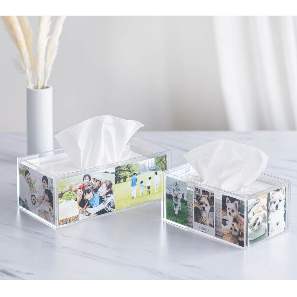毎日、目に入るティッシュケースだからこそ、心ときめくものを選びませんか?ティッシュボックスが、そのままフォトスタンドに!透明度の高い上質なアクリルを使っているため、家族やペット、あなただけの推しの写真をしっかり、くっきり、うっとり楽しめます。ティッシュケースとフォトスタンドが融合!透明感が美しいアクリル製のティッシュボックスにお気に入りの写真を挟めば、世界で一つのティッシュボックスに。ティッシュを使うたびに目に入るので楽しく、省スペースで飾れてお部屋もすっきり。大サイズは、L判写真なら6枚、スタンダードサイズのトレカなら12枚まで飾れます。旅行の思い出や愛するペットの写真のほか、推しのトレカやフォトカードを飾っても。あなたなら、何を飾る?小サイズは、スモールサイズのトレカ(59mm×86mm)を10枚まで飾れます。チェキや一部のトレーディングカードゲーム用のカードにもぴったり。大サイズは「L判写真を長辺に2枚・短辺に1枚、スタンダードサイズのトレカ(63mm×89mm)なら長辺に4枚・短辺に2枚」まで。小サイズは「スモールサイズのトレカ(59mm×86mm)を長辺に3枚・短辺に2枚」まで飾れます。ティッシュの中身のみを入れると見た目もすっきり。ペーパータオルも収納可。大は箱ティッシュ、小はソフトパックティッシュに対応したサイズ。180組のものなら2セット入れられます。新潟・燕三条の職人技が光る、手磨き仕上げの美しいアクリル透明度の高い国産アクリル板を使用。ものづくりの技術に定評のある新潟・燕三条エリアの工場で、熟練の職人が一つひとつ丁寧に手磨きしているので、角まで滑らかで美しい仕上がりです。ページ下部に画像の説明がございます。一部別売りの商品もございますので、説明文ご確認のうえご注文ください。>画像の説明はこちら<仕様・サイズ■サイズ:小…約幅20.8奥行13.3高さ9.5cm・重さ約540g、大…約幅27.3奥行14.3高さ10cm・重さ約720g■素材:アクリル樹脂■小:ソフトパックティッシュ対応、大:箱ティッシュ対応(全てのティッシュには対応しませんので、事前に内寸サイズをご確認ください)■日本製【送料マーク:A】 この商品の販売価格には配送料880円(税込)が含まれています。 画像の説明ティッシュケースとフォトスタンドが融合!大小四面すべてに写真を入れられるので、部屋の中央に置いてどの角度からでも楽しめます。四面すべてに写真を入れられるので、部屋の中央に置いてどの角度からでも楽しめます。内寸サイズティッシュの中身のみを入れると見た目もすっきり。ペーパータオルも収納可。箱、ソフトパックともにパッケージごと入れられます。ボックスは二重構造になっており、外箱と内枠の間に写真やカードを挟んで飾ります。カードはスリーブに入れたまま飾れます。新潟・燕三条の職人技が光る、手磨き仕上げの美しいアクリル