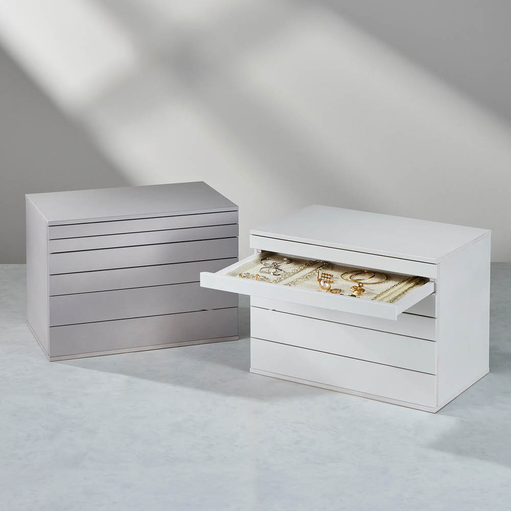 見やすく、管理しやすくするため、通常のジュエリーボックスには必ずある「仕切り」をあえてなくしました! 仕切りがなくても出し入れの際にモノが動かないように、底にすべり止めシートを敷いています。仕切りがないことで、アイテムごとではなく、「いつも合わせて使うセット」での収納が可能に。イメージ別であらかじめセットを作ってまとめておけば、身支度の時短が叶います。市販のジュエリーボックスで、こんな悩みありませんか?「持っているアイテムが偏っているので、すべての引き出しを活用しきれていない(例:ネックレスばかりでピアスを持っていないから細かい仕切りのところへ入れるものがない)」「もともとついている仕切りにアクセサリーのサイズが合わず、結局外して使っている」「仕切りを外すと引き出しを開閉するたびに中のアクセサリーの位置がずれる」そんな毎日のストレスを解消してくれる、今までにない形のジュエリーボックスを作りました。仕切りがないから、空間をフル活用して収納できます。例えばいつもセットで使っているお気に入りのネックレス・ブレスレット・ピアス・リングをまとめて同じ場所へIN。コーディネートでよく使う組み合わせごとにまとめて分けて収納すれば、いちいち複数の引き出しを何度も開け閉めしなくても、そのセットを使うときはその段だけ出せばいいので、身支度がスマートに。滑り止め付きなので、ジュエリーが乱れず、持ち運びも楽でストレスフリーすべての引き出し底は滑り止め付きなので、引き出しを勢いよく開けても中身が乱れず、美しいまま。引き出しごと持ち運んでもストレスなく、気持ちよくお使いいただけます。収納物に合わせた引き出しの深さは3種類。浅…深さ約2cm→華奢なデザインのジュエリー 中…深さ約3.5cm→大きめのモチーフが付いたアクセサリー 深…深さ約5cm→購入時のジュエリーケースやメガネケースごと収納可能 大きめのリング等は転がりやすいので、中段のみ取り外し可能なアクリル仕切り付きです。中段のみ1列ごとに取り外し可能なアクリル仕切りをセット。透明なので中身が見やすく、大ぶりのリングなども転がらず、美しくディスプレイできます。引き出し前板は無駄な装飾のないシンプルデザイン。スッキリと洗練された印象で、モダンスタイルから北欧インテリアまで幅広いテイストになじみます。ページ下部に画像の説明がございます。一部別売りの商品もございますので、説明文ご確認のうえご注文ください。>画像の説明はこちら<仕様・サイズ■色:(ア)ホワイト(イ)グレー(ウ)ブラック■サイズ:約幅40奥行25高さ30cm・重さ約6.5kg■素材:MDF(ラッカー塗装)■日本製【送料マーク:A】 この商品の販売価格には配送料880円(税込)が含まれています。 画像の説明左:グレー、右:ホワイト浅・中・深各2段ずつ滑り止め付きなので、ジュエリーが乱れず、持ち運びも楽でストレスフリー浅・中・深各2段ずつ中段のみ1列ごとに取り外し可能なアクリル仕切りをセット。透明なので中身が見やすく、大ぶりのリングなども転がらず、美しくディスプレイできます。内寸ホワイト、グレー、ブラックの3色引き出しはすっきりしたデザインホワイト、グレー、ブラックの3色