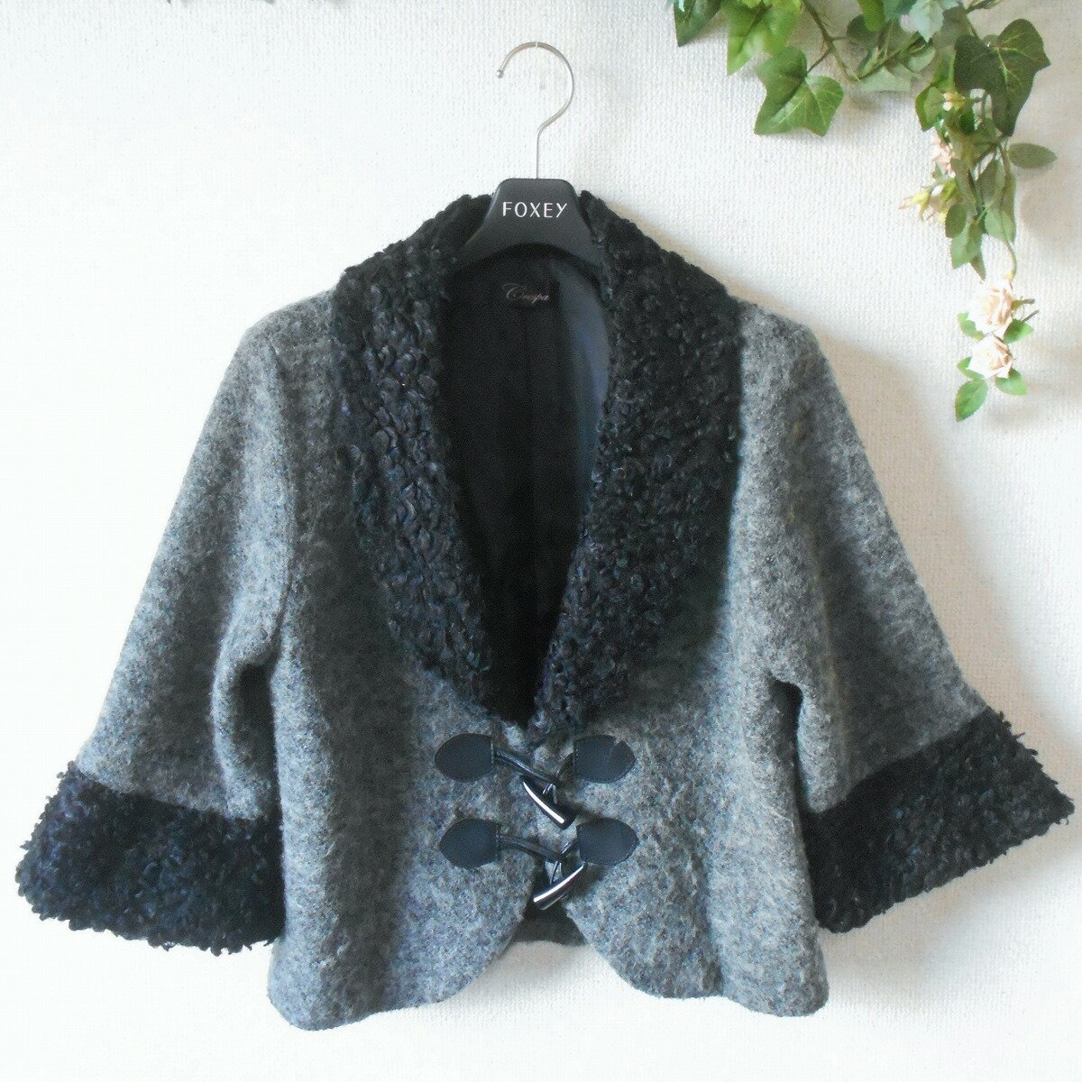 7分袖のノーカラージャケットで前はフック式の素敵なデザインです。