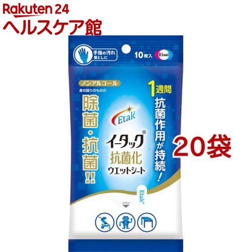 お店TOP>イータック抗菌化ウエットシート (10枚入*10袋セット)お一人様100セットまで。【イータック抗菌化ウエットシートの商品詳細】●身の回りのものをサッとひと拭きで除菌、抗菌できるウエットシートです。●特許成分「Etak(持続型抗菌成分)」の働きにより、抗菌作用が1週間持続します。●ノンアルコールタイプです。●手指の汚れ落としとしても使用できます。●携帯に便利は10枚入りです。※全ての菌に対して効果があるわけではありません。※使用状況によっては持続力が異なります。【成分】水、PG、エトキシシラン系化合物(持続型抗菌成分)、可溶化剤、安定化剤【規格概要】寸法:200mm×143mm枚数:10枚【注意事項】・目のまわり、粘膜、除毛直後の皮ふや、傷、湿疹等異常のあるところには使用しないでください。・お肌に異常のある場合やお肌に合わない場合には、ご使用をおやめください。・本品の使用により過敏症が現れた場合には使用を中止し、医師に相談ください。・鏡、ガラス、皮製品には使用しないでください。・水ぶきのできないもの(水がしみこむ白木・家具・壁材等)、精密機械、電気製品等には使用しないでください。・高温や直射日光を避けて保管してください。・乳幼児や認知症の方の手の届かないところに保管してください。(誤飲にご注意ください。)・内容成分(原材料)のにおいが感じられる場合がありますが、品質には問題ありません。・シートは水に溶けませんので、トイレに流さないでください。・カバンの中などで強く押されると液がしみでる場合がありますので、ご注意ください。【原産国】日本【ブランド】イータック【発売元、製造元、輸入元又は販売元】エーザイ※説明文は単品の内容です。※より多くの方に購入いただくために、複数回注文いただいた場合はキャンセルさせていただくことがございます。リニューアルに伴い、パッケージ・内容等予告なく変更する場合がございます。予めご了承ください。・単品JAN:4987028178873エーザイ112-8088 東京都文京区小石川4-6-100120-161-454広告文責:楽天グループ株式会社電話:050-5306-1825 イータック抗菌化ウエットシート(10枚入*10袋セット)【イータック】 1,678 ~