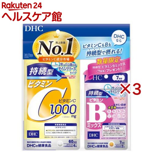 お店TOP>健康食品>ビタミン類>ビタミンC>持続型ビタミンC>持続型ビタミンC 60日分 +持続型ビタミンBミックス 7日分付き (3セット)商品区分:栄養機能食品(栄養成分:★60日持続型ビタミンC:ビタミンC★7日持続型ビタミンBミックス:ビタミンB12、ナイアシン、ビオチン、葉酸)【持続型ビタミンC 60日分 +持続型ビタミンBミックス 7日分付きの商品詳細】★60日持続型ビタミンC●消耗しやすいビタミンCが「タイムリリース処方」で体内でゆっくり溶け出し、長時間とどまります。 ●1000mg(一日摂取目安量あたり)のビタミンC配合で、キレイと元気を効率よくサポートします。 【栄養成分(栄養機能食品)】★60日持続型ビタミンC:ビタミンC★7日持続型ビタミンBミックス:ビタミンB12、ナイアシン、ビオチン、葉酸【保健機能食品表示】★60日持続型ビタミンCビタミンCは、皮膚や粘膜の健康維持を助けるとともに、抗酸化作用をもつ栄養素です。 ★7日持続型ビタミンBミックスビタミンB12及び葉酸は、赤血球の形成を助ける栄養素です。 ナイアシン及びビオチンは、皮膚や粘膜の健康維持を助ける栄養素です。 葉酸は、胎児の正常な発育に寄与する栄養素です。 【基準値に占める割合】★60日持続型ビタミンCビタミンC:1000%★7日持続型ビタミンBミックスビタミンB12:833%、ナイアシン:308%、ビオチン:100%、葉酸:83%【1日あたりの摂取目安量】★60日持続型ビタミンC:4粒★7日持続型ビタミンBミックス:2粒【召し上がり方】一日摂取目安量を守り、水またはぬるま湯で噛まずにそのままお召し上がりください。 【セット詳細】持続型ビタミンC 60日 84.0g(1粒重量350mg×240粒)+持続型ビタミンBミックス 7日 3.2g(1粒重量230mg×14粒)【品名・名称】★60日持続型ビタミンC:ビタミンC含有食品★7日持続型ビタミンBミックス:ビタミンB群含有食品【持続型ビタミンC 60日分 +持続型ビタミンBミックス 7日分付きの原材料】★60日持続型ビタミンCビタミンC、ヒドロキシプロピルメチルセルロース、セルロース、ステアリン酸Ca、微粒二酸化ケイ素★7日持続型ビタミンBミックス還元麦芽糖水飴(国内製造)/セルロース、パントテン酸Ca、ビタミンB1、ナイアシン、ヒドロキシプロピルメチルセルロース、ビタミンB6、ビタミンB2、ステアリン酸Ca、微粒二酸化ケイ素、葉酸、ビオチン、ビタミンB12【栄養成分】★60日持続型ビタミンC4粒1400mgあたり熱量:5.7kcal、たんぱく質:0g、脂質:0.05g、炭水化物:1.31g、食塩相当量:0.001g、ビタミンC: 1000mg★7日持続型ビタミンBミックス2粒460mgあたり熱量:1.8kcal、たんぱく質:0.17g、脂質:0.01g、炭水化物:0.26g、食塩相当量:0.0003g、ビタミンB1:40.0mg、ビタミンB2 :30.0mg、ビタミンB6:30.0mg、ビタミンB12:20.0μg、ナイアシン:40mg、パントテン酸:40.0mg、ビオチン:50μg、葉酸:200μg【アレルギー物質】記載なし【保存方法】直射日光、高温多湿な場所をさけて保存してください。 【注意事項】★60日ビタミンC・食生活は、主食、主菜、副菜を基本に、食事のバランスを・お身体に異常を感じた場合は、摂取を中止してください。 ・原材料をご確認の上、食物アレルギーのある方はお召し上がりにならないでください。 ・薬を服用中あるいは通院中の方、妊娠中の方は、お医者様にご相談の上お召し上がりください。 ・お子様の手の届かないところで保管してください。 ・開封後はしっかり開封口を閉め、なるべく早くお召し上がりください。 ・本品は、多量摂取により疾病が治癒したり、より健康が増進するものではありません。 一日の摂取目安量を守ってください。 ・本品は、特定保健用食品と異なり、消費者庁長官による個別審査を受けたものではありません。 ★7日持続型ビタミンBミックス・食生活は、主食、主菜、副菜を基本に、食事のバランスを。 ・お身体に異常を感じた場合は、摂取を中止してください。 ・原材料をご確認の上、食物アレルギーのある方はお召し上がりにならないでください。 ・薬を服用中あるいは通院中の方、妊娠中の方は、お医者様にご相談の上お召し上がりください。 ・お子様の手の届かないところで保管してください。 ・開封後はしっかり開封口を閉め、なるべく早くお召し上がりください。 ・本品は、多量摂取により疾病が治癒したり、より健康が増進するものではありません。 一日の摂取目安量を守ってください。 ・葉酸は、胎児の正常な発育に寄与する栄養素ですが、多量摂取により胎児の発育がよくなるものではありません。 ・本品は、特定保健用食品と異なり、消費者庁長官による個別審査を受けたものではありません。 【原産国】日本【ブランド】DHC【発売元、製造元、輸入元又は販売元】ディーエイチシー※説明文は単品の内容です。 リニューアルに伴い、パッケージ・内容等予告なく変更する場合がございます。 予めご了承ください。 ・単品JAN:4511413408322ディーエイチシー〒106-8571 東京都港区南麻布2-7-10120-333-906広告文責:楽天グループ株式会社電話:050-5577-5042[ビタミンサプリメント/ブランド:DHC/] 持続型ビタミンC 6
