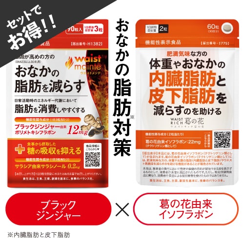 ブランド名 ウエストメンテ [waist mainte]ウエストリッチ 葛の花 [WAIST RICH 葛の花] 商品名 ウエストメンテ ウエストリッチ 葛の花 ●配合成分につきましては、上記の商品名をクリックしてご確認ください。 名称 ウエストメンテ:ブラックジンジャー抽出物・サラシア抽出物加工食品 ウエストリッチ 葛の花:葛の花抽出物加工食品 内容量 ウエストメンテ:22.5g(250mg×90粒) 約1ヶ月分 ウエストリッチ 葛の花:15.0g(250mg×60粒) 30日分 届出番号 ウエストメンテ:機能性表示食品 H1382 ウエストリッチ 葛の花:機能性表示食品 I775 届出表示 届出表示 ▼ウエストメンテ 本品にはブラックジンジャー由来ポリメトキシフラボン(12mg/1日分 3粒)、サラシア由来サラシノール(0.2mg/1日分 3粒) が含まれます。 ブラックジンジャー由来ポリメトキシフラボンは、BMIが高め(BMI23以上30未満)の方の腹部の脂肪(内臓脂肪と皮下脂肪)を減らす機能があることが報告されています。 また、日常活動時のエネルギー代謝において、脂肪を消費しやすくする機能があることが報告されています。 サラシア由来サラシノールには食事から摂取した糖の吸収を抑え、食後血糖値の上昇をゆるやかにする機能があることが報告されています。 ▼ウエストリッチ葛の花 本品には、葛の花由来イソフラボン(テクトリゲニン類として)が含まれます。 葛の花由来イソフラボン(テクトリゲニン類として)には、肥満気味な方の、体重やお腹の脂肪(内臓脂肪と皮下脂肪)やウエスト周囲径を減らすのを助ける機能があることが報告されています。 商品特徴 ▼ウエストメンテ 内臓脂肪や食後の血糖値が気になる方(※1)(※2)におすすめ。 機能性関与成分【ブラックジンジャー由来ポリメトキシフラボン】【サラシア由来サラシノール】をW配合し、脂肪と糖へ多角的にアプローチ。 おいしいごちそうも理想のボディも諦められないあなたに。 『肥満気味(※1)、おなかの脂肪を減らしたい』『食事からの糖の吸収を抑えたい』そんな、いいとこどりの機能性表示食品です。 【ブラックジンジャー由来ポリメトキシフラボン】は、肥満気味な方(※1)の12週間の摂取でおなかの『内臓脂肪』『皮下脂肪』『総脂肪』の3つの面積が有意に減少することが分かっています。 また、日常活動内の運動で、『脂肪を消費しやすく』してくれます。 【サラシア由来サラシノール】は、食事から摂取した『糖の吸収を抑え』、『食後血糖値の上昇をゆるやかにする』機能が報告されています。 ※安心のサラシア協会認定原料を使用し、サラシノールを抽出しています。 さらに多彩なサポート成分、ピペリンを含む【ヒハツエキス】・【ニーム葉エキス】・カテキンが豊富な【緑茶エキス(緑茶抽出物)】をプラス配合。 ◇着色料・香料・甘味料・増粘剤・コーティング剤 不使用 (※1)BMIが23以上30未満の健常な成人 (※2)空腹時血糖値が正常域または境界域(126mg/dL未満)の健常な成人 ▼ウエストリッチ葛の花 肥満気味な方(※1)の【体重】、おなかの【内臓脂肪・皮下脂肪】、【ウエスト周囲径】の減少を助ける、機能性関与成分『葛の花由来イソフラボン(※2)』を22mg配合(※3)した機能性表示食品。 医師監修、国内製造です。 葛の花由来イソフラボン(※2)の<脂肪がつくられる(合成)のを阻害 ><脂肪の分解を促進(白色脂肪細胞にて) ><脂肪の消費を促進(褐色脂肪細胞にて)> の3つの働きで、肥満気味(※1)なお悩みへ本格アプローチ!(※4) さらに、一日目安量たった2粒にサポ−ト成分22種類を独自にプラス配合。 サラシア抽出物や黒胡椒抽出物、ギムネマシルベスタ抽出物、ビタミン7種類、必須アミノ酸2種類、ミネラル3種類など健康維持に欠かせない多様な成分が頑張るあなたを力強くサポ−トします。 (※1)BMIが23〜30未満の健常な成人 (※2)テクトリゲニン類として (※3)一日目安量2粒あたり (※4)機能性表示食品の届出に記載されている内容を基にしています。 お召し上がり方 ウエストメンテ:1日3粒を目安に、水またはぬるま湯とともにお好きなタイミングでお召し上がりください。 ウエストリッチ 葛の花:1日2粒を目安に、水またはぬるま湯とともにお好きなタイミングでお召し上がりください。 ご利用上の注意 ●本品は多量摂取により疾病が治癒したり、より健康が増進するものではありません。 ●原材料名(ウエストメンテ・ウエストリッチ 葛の花)をご確認のうえ、食物アレルギーのある方はお召し上がりにならないでください。 ●天然原料を使用しておりますので、まれに変色することがございますが、品質上問題ありません。 ●まれに体調や体質により合わない場合がありますので、その場合はご使用を中止してください。 ●乳幼児の手の届かない場所に保存してください。 ●開封後はお早めにお召し上がりください。 品質保持のため、チャックをしっかり閉めた状態で保存してください。 ●一日の摂取目安量を守り、過剰摂取にならないようにご注意ください。 ●食生活は、主食、主菜、副菜を基本に、食事のバ