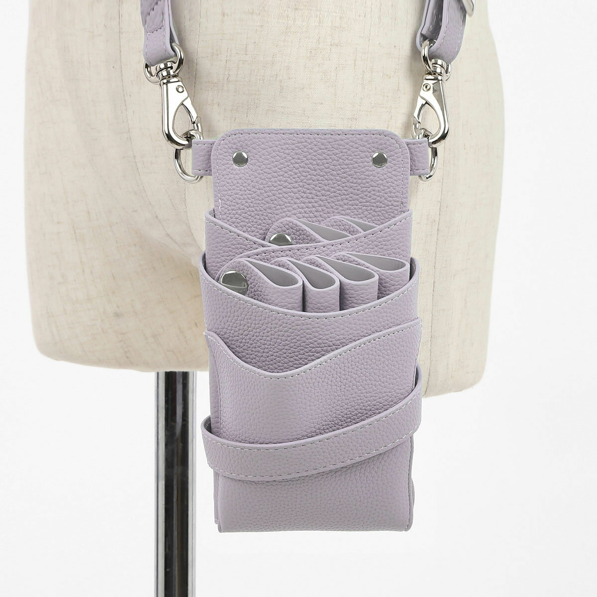 ■210×120×60 ■PUレザー (合成皮革) ■4~6丁入※後列の2丁入れはそれぞれ取り外し可能ホルダー ■カラー ライラック ■専用ベルト付き(腰巻き&肩掛け兼用 送りカン調整タイプ) 全長66cm~121cm程度(金具含む) ※色やロットによってサイズに若干の差異がある場合がございます。 くすみ感のある淡いパープルのPUレザーにシルバーの金具を使用したお洒落なシザーケースです。 ▼4〜6丁入れ 人気No,1シエーナの特徴▼ 【後列2丁は取り外し可能】 後列2丁を取り外せば、メモやスマホなどが入れられて、用途に合わせて、ご自身に合った使い方ができます。 【お手入れかんたん、分解機能】 裏面のボタンを外せば、各パーツが取り外せるので、面倒なお手入れもパパッと簡単に行えます。 【肩掛け・腰巻きどちらも使える2WAYベルト】 用途に合わせて使い分けができます。 【小物がたくさん入る】 あちこち行きがちなコームや、たくさん付けたいダッカールなど それぞれが定位置に収納できるように設計された前面ポケットやダッカールベルト付き。 ▲コメント▲ くすみ感のある淡いライラックカラーのシザーケースが新登場しました。 上品で落ち着きのあるライラックはコーディネートの差し色としてもおすすめです。 ※1枚目のハサミ、コーム、ダッカールは付属しません。 ※沖縄と周辺の離島や一部地域に限り合計3,980円(税込)以上の場合も880円、北海道、九州は550円の送料を頂戴しております。 ▼広告掲載商品▼ グローブホルダー ★?800 OFF★ シザーケースと同時購入でお得です! 【数量限定】国内シザーケース専門メーカー 職人手作り / DEEDS シエーナ no.432 ライラック 4~6丁入 シザーケース / 美容師 理容師 トリマー フローリスト シザーケース シザーバッグ 17,380 ~