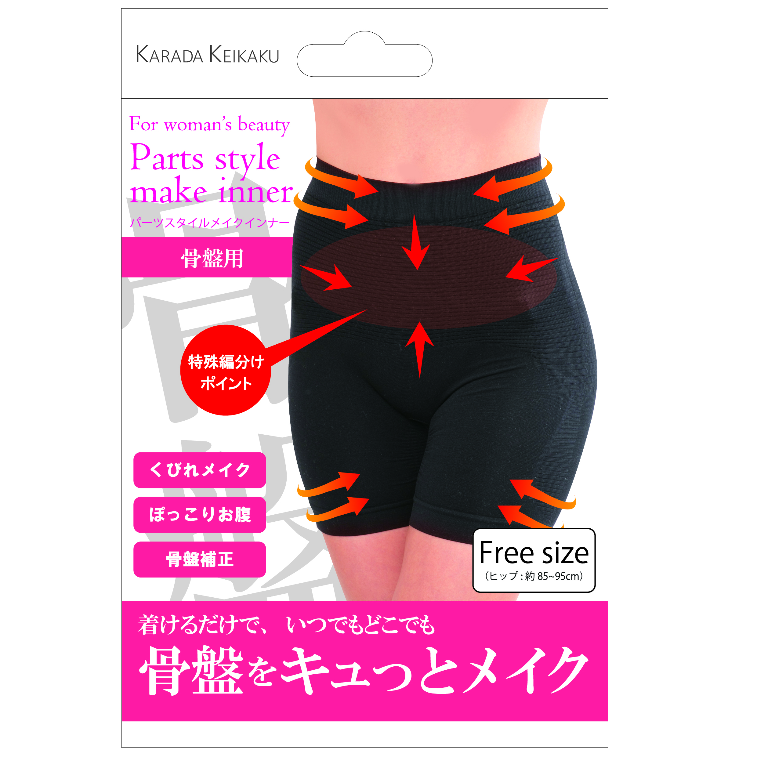 ・美容雑誌とコラボした着圧インナー商品です。 ・お悩みのパーツ別に集中サポートができ、薄型で洋服の上からも目立たないからいつでもどこでも簡単にケアができます。 ・着けるだけで骨盤をしっかり引締め集中加圧補正!下がりがちなヒップも女性らしい美尻でパンツスタイルに自信を! ・爪で引っ掛けないように両足を通し装着し、骨盤部分、ヒップアップラインの位置を調整してください。