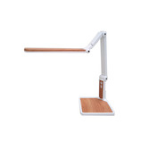 ・木目調のインテリアにマッチするLEDデスクライトです。 ・照明発光部からアームまで、スタイリッシュなデザインで統一されています。 ・同時に6カ所の可動部を持つ6軸アームにより、照明発光部の高さや位置も自由に動かせます。 ・デスクライトが邪魔になることなく、明るいデスクの上で、読書や学習、作業ができます。 ・調光ボタンで光の明るさを100%(最大点灯時)?約20%の4段階または無段階で調光が可能です。 ・スイッチONの時、急激に明るくならず、ふんわり明るくなります。 ・学習やレポート作成などのビジネスシーンにおいても、タブロイド新聞(406mm×545mm)を広げたサイズまで、無駄なく、手元を照らしてくれます。 ・最大照度は、1500lx(40cm直下)、また消費電力が6.7Wと発光効率が高く、大型デスクライトとしてはトップクラスの省エネルギー化を実現しました。