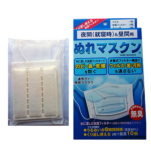 ・風邪の季節になると加湿器や湯沸しの蒸気で、部屋の空気に湿り気を与えたり、 濡れマスクを使って、のど・鼻の乾きを予防する生活の知恵が昔からあります。 ・「濡れマスク」とはのど・鼻を効率よく加湿するとともに、 害の多い口呼吸を防止する方法です。 ・室内を加湿器で湿らすのではなく、鼻の入り口付近に水蒸気の発生源を用意すれば、 部屋は適度な乾燥状態を維持しつつ、のど、鼻は潤います。 ・多重式フィルター構造で、ウイルス、菌、花粉を通しません。 16個の通気穴が開いているので、呼吸がとても楽にできます。 ・水に浸した加湿フィルターなので、匂いが気になりません。 ・ワイヤーとプリーツが入った衛生用不織布マスクで、顔にフィットしやすい。