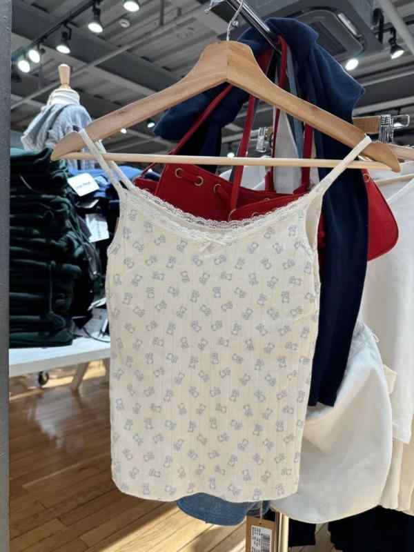 トップス レディース ミントブルー クマ刺繍 吊り紐キャミソール デサイン レース 蝶結び 内側レイヤード 短め上着 かわいい 伸縮性 綿素材 ビッグシルエット 普段使い 軽量 春夏 4,388 ~