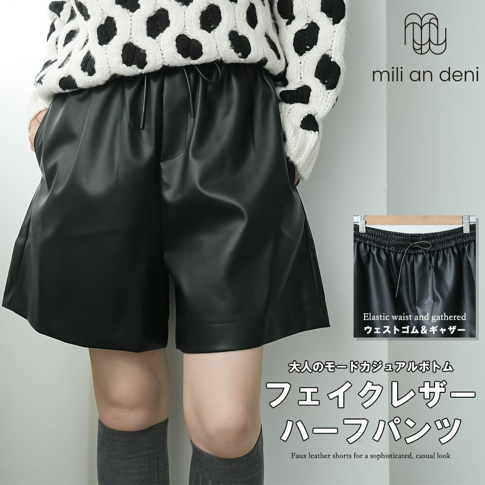 【18%OFFクーポン☆】フェイクレザーハーフパンツ ショートパンツ ゆったり ショート丈 ブラック 黒 無地 M ウエストゴム ゆったり きれいめ ボトムス レディース 冬 ミリアンデニ 2,999 ~