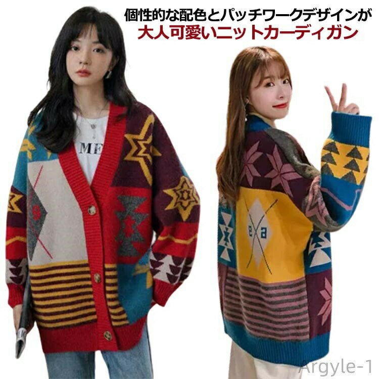 数量限定クーポン配布中●【送料無料】ニットカーディガン パッチワーク レディース ジャガード ニット カーディガン 幾何学柄 総柄 秋 冬 アウター 厚手 2,710 ~