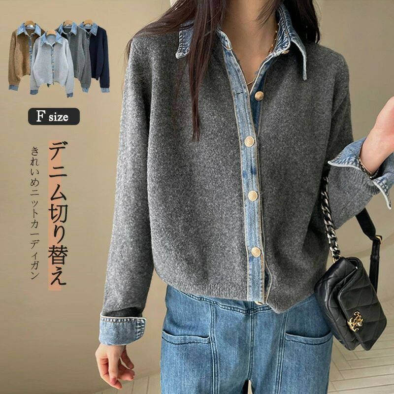 無地 アウター 羽織り 秋 ジャケット 紺色 ニット おしゃれ ネイビー 前開き デニム切替 シャツ 長袖 デニム ニットカーディガン 冬 暖か ドッキング カーディガン ショート丈 ニットカーデ レディース トップス グレー 4,796 ~