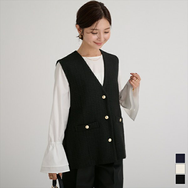 ◆DETAIL 上品なツイード生地で仕立てたジレベスト。 ウエストラインをほどよくシェイプさせることで、スタイルアップ効果を叶えつつ、すっきりとした印象に仕上げました。 フロントのゴールドボタンが華やかさを添え、セレモニーシーンにもふさわしい一着です。 ◆FABRIC 表情のあるツイード素材を使用。 程よい厚みとハリ感が上品な印象をプラスし、オケージョンから日常のきれいめスタイルまで幅広く活躍します。 [型番:BHXN2316]■カラー:ブラック、ネイビー、ホワイト【S】着丈:63、肩幅:34、アームホール:39、バスト:86、裾幅:55.5【M】着丈:65、肩幅:36、アームホール:41、バスト:90、裾幅:57.5【L】着丈:67、肩幅:38、アームホール:43、バスト:94、裾幅:59.5※( )で表記されている数字はヌードサイズです。 ヌードサイズとは衣服を身につけない身体のサイズです。 お客様ご自身の身体サイズと比較してお選びください。 ■素材: 【本体】ポリエステル 100%【裏地】ポリエステル 100% ■お手入: >>商品のお取り扱い方法 ■原産国: 中国ツイードジレベスト/ユアーズ(ur's)ブラックネイビーホワイト画面上と実物では、多少色具合が異なって見える場合がございます。