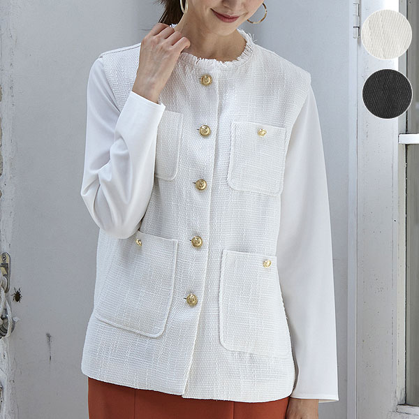 <サイズ表> 単位cm サイズ バスト(適応サイズ) 肩幅 着丈 S 94(72?80) 39 60 M 98(79?87) 40.5 62 L 104(86?94) 42 64 製品仕様 着用シーズン目安 秋冬春 カラー ホワイト/ブラック 素材 表地/ポリエステル94%・綿4%・レーヨン2%、裏地/ポリエステル100% 洗濯 ドライクリーニング可 生産国 中国羽織るだけで上品エレガンス ツイードベスト オンでもオフでも着回しできる優秀アイテム 手持ちの服に重ねるだけで、簡単にトレンドの着こなしが可能な上品ツイードベスト。 ジャケットには早いけど、ブラウスだけじゃ物足りない時に、プラスオンするだけでたちまちクラス感アップ!表面感のあるツイード生地が華やかで金ボタンがアクセントになっています。 カラーはホワイトとブラックの2色からお選びいただけます。