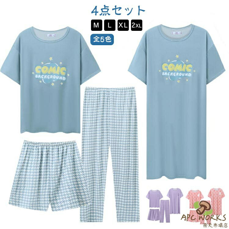 Tシャツ レディース ロングパンツ 【4点セット】パジャマ 大きいサイズ ワンピース リラックス ショートパンツ 夏 長ズボン 寝巻き 春秋 部屋着 女性 ウエストゴム 上下 セットアップ 【4点セット】パジャマ ラウンドネック おしゃれ ルームウェア