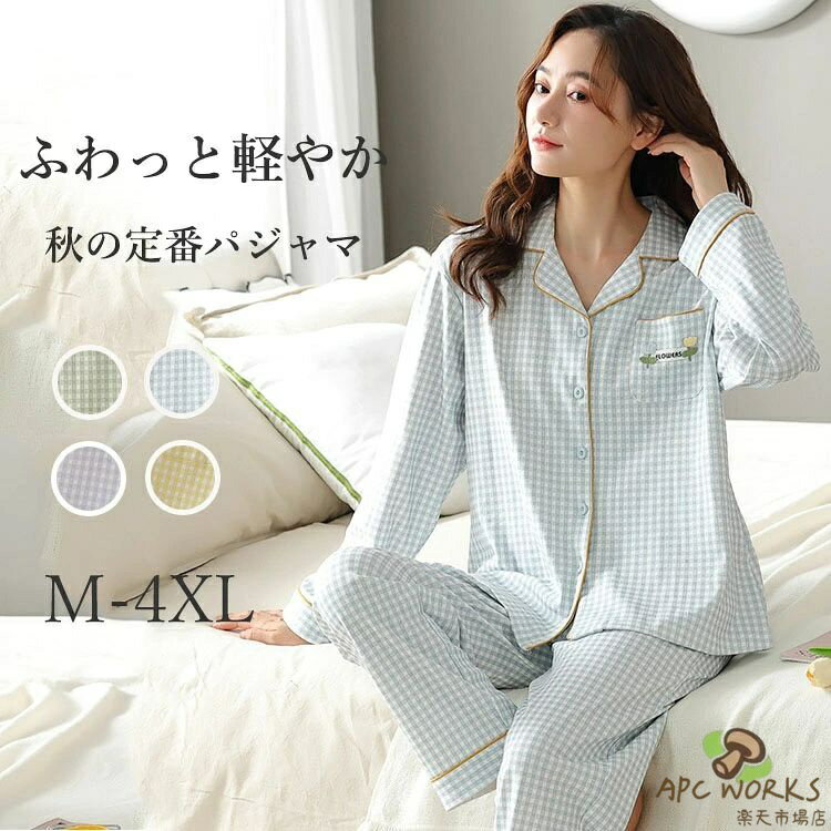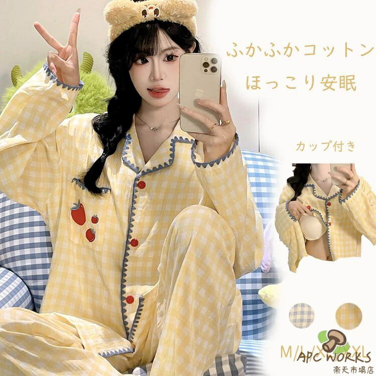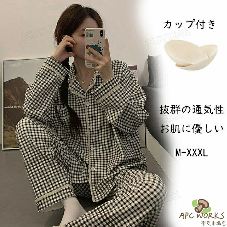 パジャマ レディ一ス 秋 夏用 長ズボン 長袖 綿 コットン カップ付き 前開き チェック 安い 柔らか セットアップ 上下セット ルームウェア 部屋着 寝間着 可愛い 肌触り 韓国 ロングパンツ 薄手 吸汗 着心地 プレゼント 春 外出 旅行 入院 おしゃれ 母の日 敬老の日 授乳