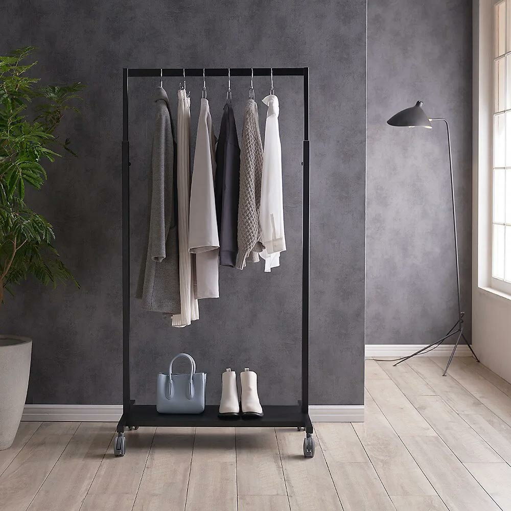 頑丈さと収能力を重ね備えたブルックリンスタイルのハンガーラック。 アイアンフレームの質感が際立つシックなブルックリン風デザイン。 ナチュラル感をプラスする木製棚板で収納力もアップしました。 インダストリアルデザインが印象的今人気のインダストリアルデザインがおしゃれな衣類収納ハンガーです。 天然木のような風合いの棚とブラックアイアンが調和したヴィンテージ風デザイン。 ニューヨークのようなブルックリンインテリアが好きでリビングや寝室に衣類収納スペースを増やしたい方におすすめです。 頑丈な造りで、衣類のほか上下の棚に靴やバッグまで収納上質な雰囲気と収納力が魅力のクローゼットハンガーラック上下の棚はナチュラルな天然木風に仕上げました。 高級感のあるマットブラック仕上げのフレームが大人の雰囲気を演出するクローゼットハンガーです。 置くだけでブティックのようなおしゃれなワードローブ空間が演出できます。 洗練されたデザインがお部屋をブティックのようなクラス感のあるリッチな印象に。 たっぷり洋服が掛けられる、耐荷重約65kgの頑丈ハンガーバーハンガーバーのジョイント部に強度を持たせた頑丈仕様です。 ハンガーバーは洋服の丈に合わせて、約17cm間隔で3段階に高さが調節できます。 ワンピースやロングコートなどの丈の長い洋服も掛けられる高さがあります。 クローゼットの中だけでなく、玄関や寝室のコートハンガーとしてもおすすめです。 上下の木製棚板は収納ケースやバッグ収納に便利棚板裏は補強バー入りの頑丈構造。 折り畳んだ衣類やズボン、スラックスなどもまとめて収納。 頑丈なキャスター付き。 衣替えや模様替えのときも洋服を掛けたままスムーズに移動できます。 動かさない場合はアジャスターをお使いください。 脚部アジャスターは1.5cmの高さ調整が可能です。 ページ下部に画像の説明がございます。 一部別売りの商品もございますので、説明文ご確認のうえご注文ください。 >画像の説明はこちら<仕様・サイズ■サイズ:幅90cm奥行47cm高さ167(アジャスター時161)cm■素材:本体…スチール(粉体塗装) 棚板…化粧板■総耐荷重(アジャスター使用時)約65kg■台湾製【組み立て時間約40分】【送料マーク:D】 梱包サイズが大きいため、お部屋まで搬入できない場合があります。 ご注文の際は、必ず事前に梱包サイズと設置場所までの搬入導線(通路の幅・高さ等)をご確認ください。 >詳細な説明はこちら<この商品の配送料は5000円(税込)です。 ※北海道・九州・沖縄は地域特別配送料がかかります。 この商品は下記のサービスが選択できます。 ※組み立て・開梱サービスは日時指定ができません。 お届け前に配送所より配達日時のご連絡をさせていただきます。 ※別途配送料金がかかります。 有料組み立てサービス※開梱サービス付きについて有料開梱サービスについて 画像の説明コーディネート例。 お届けは(シングル 幅90)となります。 シングル 幅90脚はキャスターとアジャスターどちらも付属。 動かさない場合はアジャスターをお使いください。 脚部アジャスターは1.5cmの高さ調整が可能です。 ハンガーバーは洋服の丈に合わせて、約17cm間隔で3段階に高さが調節できます。 上下の木製棚板は収納ケースやバッグ収納に便利棚板裏は補強バー入りの頑丈構造。 折り畳んだ衣類やズボン、スラックスなどもまとめて収納。 HS Brooklyn/エイチエスブルックリン 上下棚付頑丈ハンガー シングル 幅90 ハンガーラック パイプハンガー 衣類収納 H95617 \LINE友だち登録でクーポン/ 23,900 ~