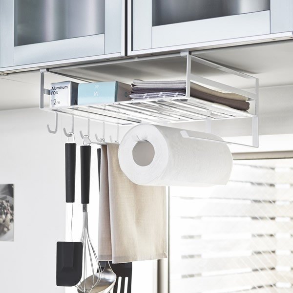吊り戸棚下を有効活用よく使うキッチン小物をたっぷり収納。 キッチンペーパーや布巾、調理道具、ラップ類、レシピ本など一括収納。 お弁当箱、スパイスやパスタなどのストックに。 頻繁に使うフライパン(直径28cmまで)も入ります。 ラック下の隙間を利用してポリ袋やティッシュ箱からそのまま取り出せます。 布巾やタオルを掛けられるハンガーが3本。 キッチンツールをかけておくのに便利なフックが5本。 取付可能な吊り下げ戸棚(約):棚板の厚さ/1.4〜2.5cmまで。 取付可能なキッチンペーパー(約):高さ24cmのキッチンロールペーパーに対応しています。 商品サイズ(約)幅30.5×奥行26×高さ16cm棚内寸サイズ(約)幅30×奥行25.5×高さ6.5cm材質本体/スチール(粉体塗装)耐荷重(約)棚/2kg ハンガー1つあたり/250g フック1つあたり/200g品番2845製造国中国製造メーカー山崎実業関連キーワード: 山崎実業 山実 yamazaki tower タワー 多機能 収納 ラック 戸棚下 吊戸棚下 マルチラック フック付き 戸棚下収納 吊戸棚 吊り戸棚 小物収納 キッチンツール 調理器具 ペーパーホルダー キッチンペーパー 調理器具 調理道具 5連フック 布巾 ふきん ラップ類 レシピ本 ポリ袋 ハンガー3本 幅30.5 奥行26 高さ16 センチ cm スチール製 耐荷重2kg キッチン用品 キッチングッズ 台所グッズ 台所用品 デッドスペース 有効活用 空間活用 スリム コンパクト 省スペース すっきり 片付く おすすめ 白 山崎実業 tower タワー 戸棚下多機能ラック ホワイト 3,520 ~