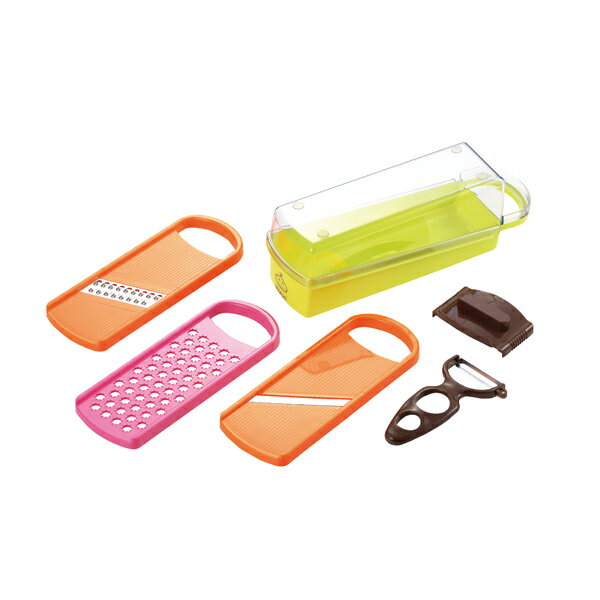 【商品説明】●1台で「スライス・千切り・ツマ切り・おろし」ができる調理器セットです。 ●安全に無駄なく調理できる指ガード付き。 ●スライサーは両刃なので、食材を往復させてスライスできます。 ●フタはそのまま受け皿として使用可能。 ●食洗機可能なので、お手入れ簡単です。 ●食材を以下の厚さで調理することができます。 スライサー/約1mm厚 千切り用/約3mm幅 ツマ切り用/約1.5mm幅 ※調理サイズは設計値で、食材や押し込む力によって変わります。 ●サイズ(約):190×80×90mm●重量(約):370g●材質:【スライサー】刃部/ステンレス刃物鋼 本体/ABS樹脂(耐熱温度100℃)【千切り器・ツマ切り器】金属部・刃部/18-8ステンレススチール プレート部/ステンレス刃物鋼 本体/ABS樹脂(耐熱温度100℃)【おろし器・指ガード・収納ケース】ABS樹脂(耐熱温度100℃)【受け皿】樹脂部/AS樹脂(耐熱温度100℃) 滑り止め/シリコーンゴム(耐熱温度200℃)●日本※メーカーの都合によりパッケージ、内容等が変更される場合がございます。 当店はメーカーコード(JANコード)で管理をしている為それに伴う返品、返金等の対応は受け付けておりませんのでご了承の上お買い求めください。 【代引きについて】こちらの商品は、代引きでの出荷は受け付けておりません。 【送料について】北海道、沖縄、離島は送料を頂きます。
