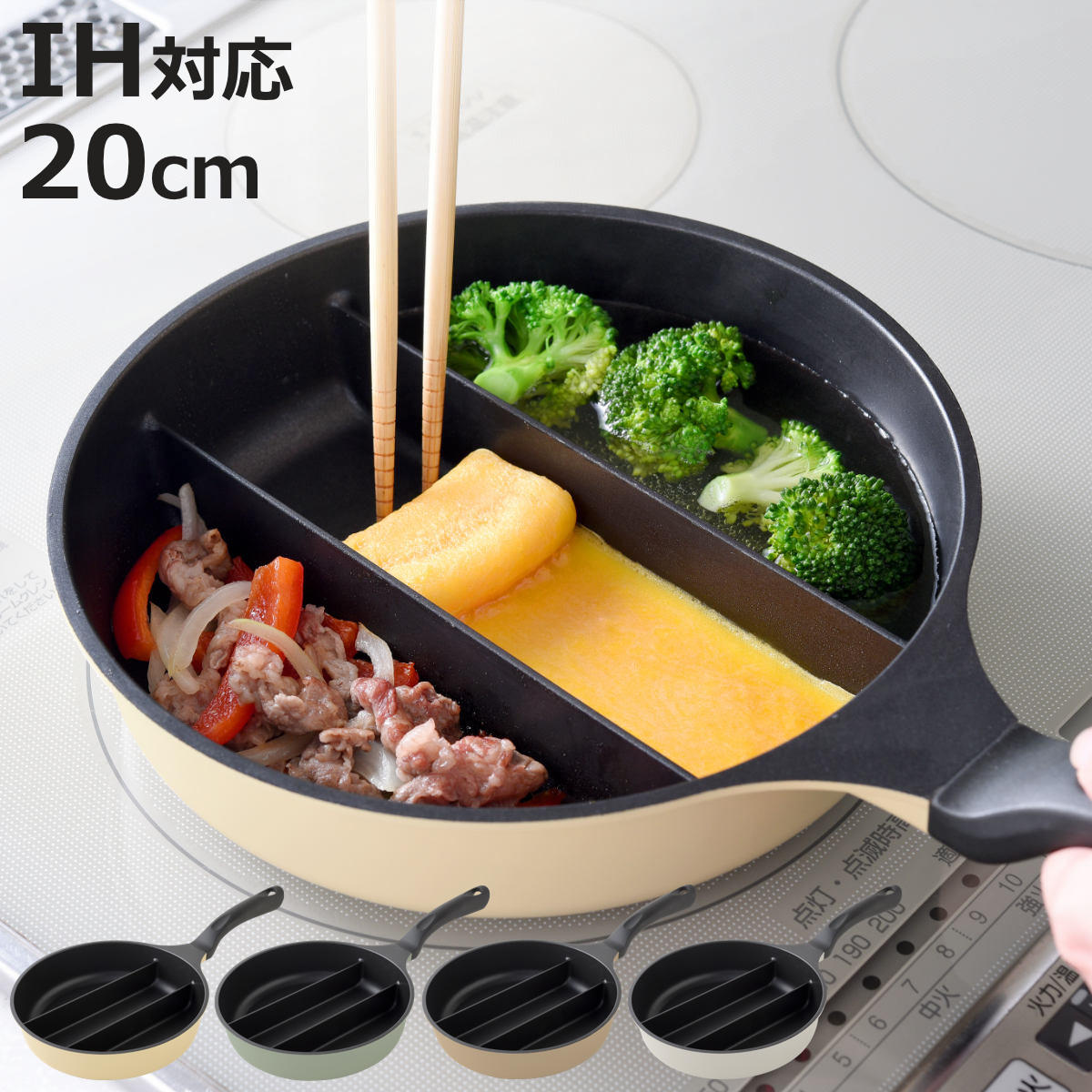 サイズ約 幅24.5×奥行41×高さ9(cm)仕切りの高さ:約 1.5(cm)底の厚さ:約 4(mm)重量約 820g内容量1個材質本体:アルミニウム合金内面:ふっ素樹脂塗膜加工外面:焼付け塗装(底面:鉄溶射加工)ハンドル:フェノール樹脂、 ステンレス鋼種類オリーブ、カフェラテ、ミルク生産国中国製食器洗い乾燥機使用不可熱源IH・ガス火両対応区分返品・キャンセル区分(小型商品)ギフトラッピングページを見るフライパン センターエッグトリプルパン IH対応 仕切り付きおすすめポイント3つの仕切りで同時に調理できるセンターエッグトリプルパン仕切り付きなので、ひとつで3種類のおかずを同時に調理できます。 忙しい朝のお弁当づくりや朝食準備がぐっとスムーズになります。 卵1個でふんわり玉子焼き中央スペースは卵1個分の玉子焼きが作りやすい幅です。 仕上がりはお弁当にぴったりのサイズ感です。 少量でもふんわり巻きやすく、きれいに仕上がります。 洗い物はこれひとつで完了複数のフライパンを使わなくても調理ができるため、洗う手間も一度で済みます。 火にかけるのも1回で、省エネにもなり効率よく調理できます。 商品詳細汁気のあるおかずも隣に移りにくい仕切りの高さは約1.5cmあるので、汁気のあるおかずも隣に移りにくいです。 食材が混ざりにくく、食材を茹でることもできます暮らしに溶け込むくすみカラーオリーブは、オリーブの葉を思わせる、暮らしに植物を添えるような癒しのカラーです。 カフェラテは、エスプレッソにミルクをひとすじ落としたような、滑らかで上品な色合いです。 ミルクは、フレッシュミルクを思わせるピュアホワイトは、シンプルさの中に美しさが際立つカラーです。 カラーシリーズ紹介センターエッグトリプルパンセンターエッグトリプルパンくすみカラー【▲このページの商品】センターエッグトリプルパンmini 20cm関連キーワード:玉子焼きフライパン エッグパン 卵焼き たまご焼き 熱伝導 お弁当作り 時短 1人暮らし ひとり暮らし 初心者 新生活 新生活準備 人気 便利 おすすめ 焦げにくい コゲにくい お手入れ簡単 フッ素コーティング 調理用品 料理道具 台所用品 調理小物 キッチングッズ キッチンアイテム キッチン小物 キッチン雑貨 調理器具 キッチン用品 調理道具 実用的 ナチュラル おしゃれ お洒落 オシャレ ニュアンスカラー 白 ホワイト ブラウン グリーン 可愛い かわいい LH20205 関連商品はこちらフライパン センターエッグトリプルパンmini3,850円フライパン IH対応 仕切り付き トリプルパン3,730円フライパン 仕切り付き IH対応 チーノ フッ2,780円フライパン 仕切り付き IH対応 フッ素樹脂加1,770円卵焼き器 13×18cm ガス火専用 軽量 ウ1,600円卵焼き器 13×18cm IH対応 軽量 ウル1,770円フライパン センターエッグトリプルパン IH対4,950円フライパン 仕切り付き IH対応 フッ素樹脂加1,770円フライパン 角型 15×18cm IH対応 ニ1,770円卵焼き器 13×18cm IH対応 ミディーズ1,770円玉子焼き器 13cm×18cm IH対応 VI2,290円仕切りフライパン IH対応 ツインパン 鉄製 3,080円 フライパン センターエッグトリプルパン IH対応 仕切り付き ( ガス火対応 仕切り付きフライパン 玉子焼き ふっ素加工 軽い 仕切りつき フッ素加工 アルミ製 朝食 弁当 時短調理 軽量 ガスOK 直火OK 玉子焼き器 卵焼き器 )【3980円以上送料無料】 4,950 ~