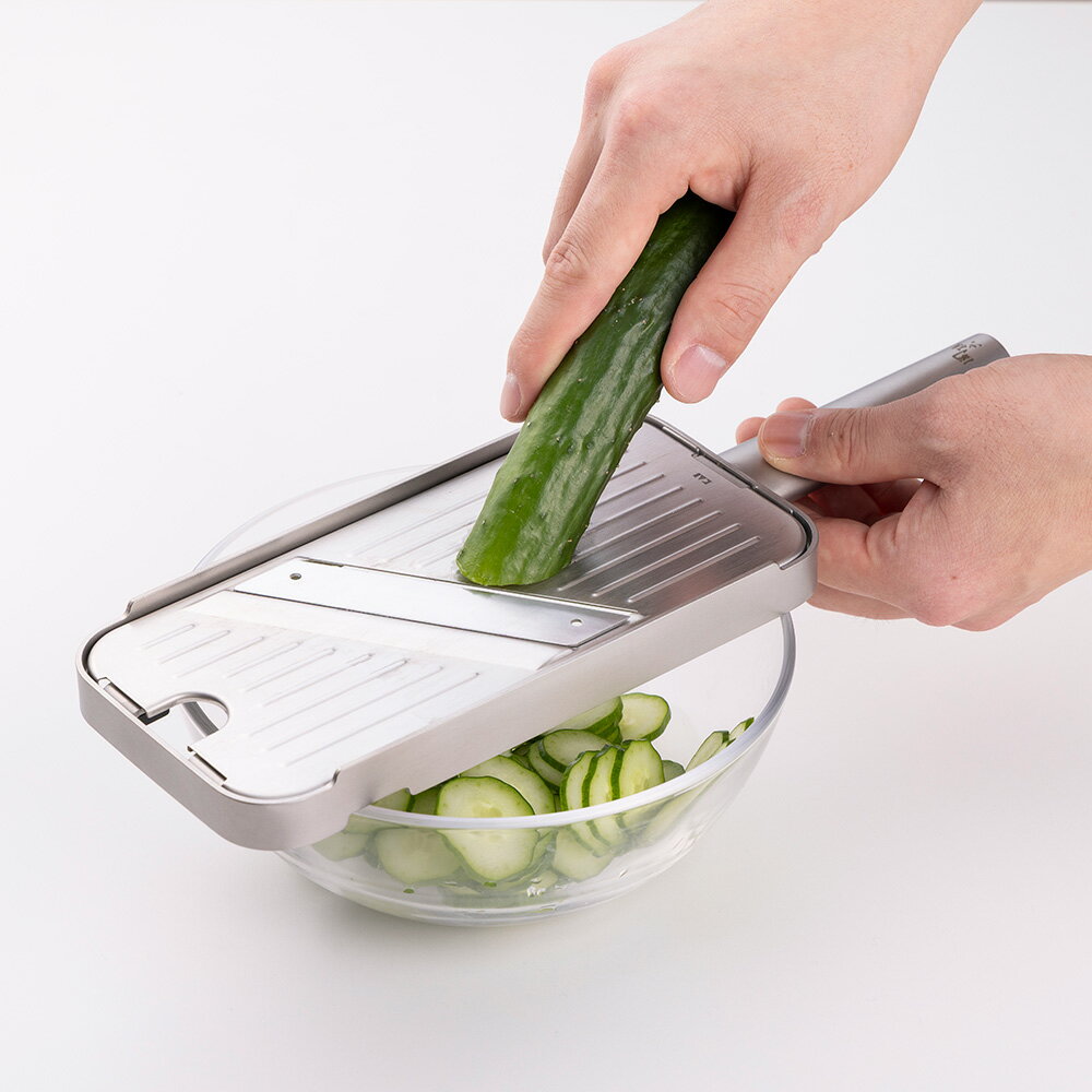 驚きの切れ味を、あなたのキッチンに。 「これ以上はムリ」という薄さまで、美しくスライスできると評判のスライサー。 ドイツ製のこちらのステンレススライサーは、料理研究家の有元葉子さんも10年以上愛用する本格派。 いつもの野菜が、まるでレストランの一品のように仕上がります。 手を添えた瞬間から実感できる、スムーズな切れ味をぜひご体感ください。 料理の幅がぐんと広がる11段階調節夏の新生姜づくり、お正月の大根のなます、キャラメルレモン、手作りポテトチップス…厚さ0.3mm間隔で11段階も調節できるから、和食からスイーツ、おつまみまで自由自在。 ハンドガード付きで指先も安心。 重さ約380gの軽やかなボディに、ドイツの職人技が息づいています。 (ページ1)料理好きの「欲しい」が詰まった設計本体の先端には、滑り止め用のシリコン脚付き。 ボウルにしっかりフィットし、とても安定してご使用いただけます。 収納時は、ダイヤルを「0」にすることで刃が隠れるので、うっかり手を切る心配もありません。 お客様からは「もっと早く買えばよかった!」と喜びの声が続々届いています。 お料理の時間がきっと楽しくなる「野菜を薄く切るだけで、いつものお惣菜がごちそうになる」という声も。 スライスで変わる食感と見た目。 そして、使いやすさと美しさを備えたデザイン。 有元先生のレシピも公開中。 今日からあなたの“お気に入り”に加えてみませんか?料理研究家 有元葉子さん100冊以上の著書を持ち、雑誌やテレビなど幅広く活躍。 おいしい料理はもちろん、長く使える本当にいいものを見る目や、すっきりとした快適な暮らしぶりに憧れるファンが多い。 台所道具のシリーズ“ラバーゼ”のディレクター。 ページ下部に画像の説明がございます。 一部別売りの商品もございますので、説明文ご確認のうえご注文ください。 >画像の説明はこちら<仕様・サイズ■サイズ:幅12長さ40高さ5cm・重さ約380g、刃部幅7cm■本体・刃…ステンレス、ハンドガード…ポリプロピレン■0.3mm間隔で11段階の厚さ調節が可能。 ■本体先端部にはすべり止め用のシリコン脚付き■ドイツ製(ハンドガードは中国製)【送料マーク:A】 この商品の販売価格には配送料880円(税込)が含まれています。 画像の説明使用イメージ 新生姜もうすーくスライスできます。 スライサーは樹脂製の物が多いけれど、こちらはオールステンレス性。 清潔に保てます。 野菜たっぷり冷しゃぶ。 いつもの野菜もご馳走になります。 生姜の甘酢漬けハス入りのナマス。 (スライサーだけでは千切りにはなりません)料理研究家の有元葉子さんもご愛用ニンジンも大根も極々薄くスライスできます。 この薄さは包丁ではできません。 11段階に厚さを調節できます。 ダイヤルの目盛り「0」にセットすると、刃部分の隙間がなくなるため、収納時にも手を切る心配がなく安全。 特になます作りには必須です。 。 (スライサーだけでは千切りにはなりません)透けるほど薄く切ることができます。 ポテトチップスキャラメルレモン 薄く切ってこそ、おいしいものがあるんです。 (左上)なす (右上)紫玉ねぎ (左下)みょうが (右下)きゅうり料理研究家 有元葉子さん 100冊以上の著書を持ち、雑誌やテレビなど幅広く活躍。 おいしい料理はもちろん、長く使える本当にいいものを見る目や、すっきりとした快適な暮らしぶりに憧れるファンが多い。 台所道具のシリーズ“ラバーゼ”のディレクター。 ハンドガード付きで安心です。