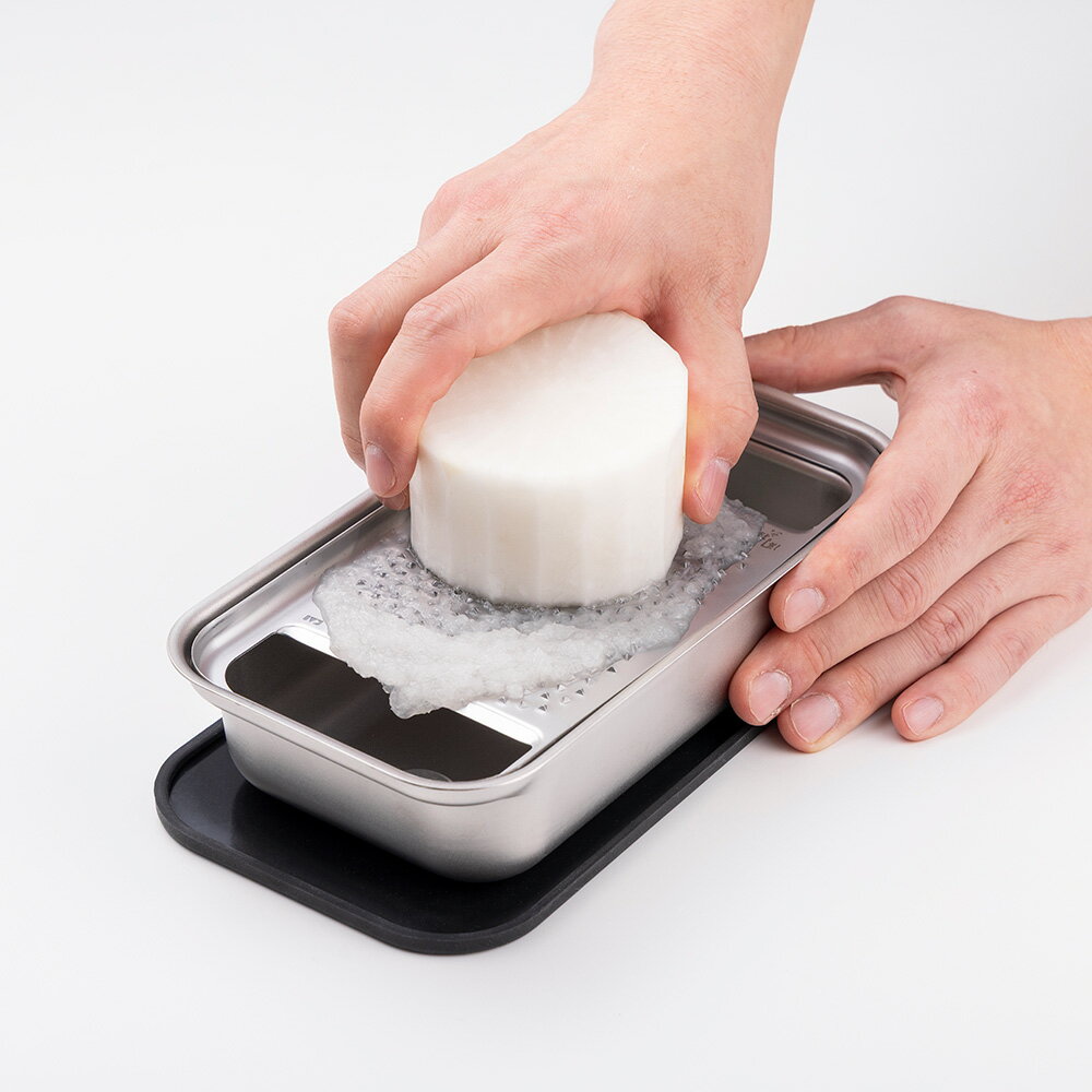 目立てにこだわった日本製薬味おろし器老舗刃物メーカー貝印の「関孫六」シリーズから、ステンレスの薬味おろし器が登場。 こだわりの三角錐の目立てで、軽い力でおろすことができます。 生姜やわさびなどの薬味が細かく均一に、ふんわりと仕上がります。 薬味をおろしたらそのまま調味料を入れることもできます。 受け皿もステンレスでシンプルな構造。 おろしを使用したあとはサッと水を流せば食材が流れるのでお手入れもラク。 シリコーン製カバーも付属。 収納時には蓋に、使用時には滑り止めになります。 ページ下部に画像の説明がございます。 一部別売りの商品もございますので、説明文ご確認のうえご注文ください。 >画像の説明はこちら<仕様・サイズ■幅11.6cm奥行10cm高さ1.9cm・重さ77g■素材:ステンレススチール■おろし器・シリコーン製カバー付き■日本製【送料マーク:A】 この商品の販売価格には配送料880円(税込)が含まれています。 画像の説明薬味おろし器は軽い力でショウガやわさびも美味しい味わいに。 薬味おろし器