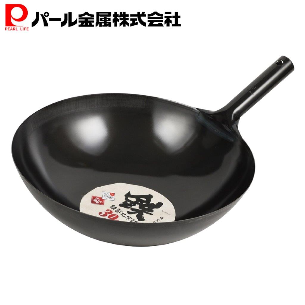 【商品概要】 強火で一気に高温調理 ガス火専用 確かな品質『日本製』 【スペック】 本体サイズ:全長48×幅33×高さ17.5cm 重量(kg):1.3 表面加工:本体/クリアラッカー塗装 材料の種類:本体・取っ手/鉄 寸法:33cm 使用前の準備:流通段階での錆を防ぐために、全面にクリアラッカー塗装を施してあります。 ご使用前に塗装を落としてください。 その後、油を多めに入れてくず野菜を十分に炒めて、油をなじませてください。 塗装の落とし方:食器用洗剤を付けたスポンジで洗い、水気を拭き取る。 コンロのゴトクにのせ、中火で加熱します。 フライパンが熱くなってきたら火を強め、中央から側面まで移動させながら全体に青っぽい色になるまで焼いてください。 ご注意:素材が鉄のため、保管の際に水気や汚れ等を付着したまま保管されますと錆が発生します。 錆が発生した場合には、錆を落とし水気を拭き取って油を塗ってから保管してください。 ご注意:つけ置き洗いや食器洗い乾燥機には使用しないでください。 錆の原因になります。 オーブン対応:不可、食器乾燥機対応:不可、食洗機対応:不可、電子レンジ対応:不可 外装サイズ(約):高さ48×幅33×奥行15(cm) 外装重量(約):1.2(kg) パール金属公式 中華鍋 ブラック 33cm 鉄製 北京鍋 HB-4216 鍋フライパン キッチン収納 整理整頓 省スペース 積み重ね スタッキング 食洗機対応 4,090 ~