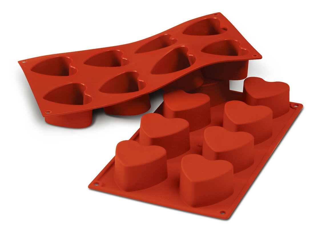 こちらの商品は1個単位での販売となります。 [規格]8個取 [容量]1個あたり90ml 総量720ml [素材]シリコンゴムイタリアsilikomart(シリコマート)社のシリコン型です。 原料に有害物質を含んでおりませんので、使用中に煙やにおいが出ません。 熱伝導に優れ、型離れが良く、使用後の洗浄も簡単です。 柔軟性も高く折りたたんでも元の形に戻るため、コンパクトに収納出来ます。 使い勝手の良い可愛いハート型は焼き菓子はもちろん、ムースを冷やし固めたりするのにも大変便利です。