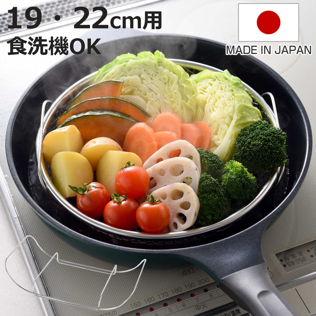 サイズ約 高さ9.2(cm)直径:約 24.5(cm)プレート深さ:約 1cmプレート内径:約 18cmフタ高さ:約 6cm重量約 500g内容量1個材質蒸し器:18-8ステンレス鋼蓋:18-0ステンレス鋼ツマミ:フェノール樹脂ガラス:全面物理強化ガラス生産国日本製食器洗い乾燥機使用不可電子レンジ使用不可備考※内径20?22cmのフライパンに対応します区分返品・キャンセル区分(小型商品)ギフトラッピングページを見るフライパン用蒸し器 20?22cm用 ガラス蓋付き 日本製おすすめポイントフライパンに乗せるだけで蒸し器に変身20?22cmのフライパンに対応お手持ちのフライパンにのせるだけで、蒸し料理が作れるステンレス製の蒸しプレートです。 大きな専用蒸し器をわざわざ準備しなくても、手軽に蒸し料理が作れます。 プレートと蓋のみなので、簡単に洗うことができ、かさばらず収納できるのもうれしいポイントです。 たっぷり蒸せるドーム型ドーム型の蓋はしっかり加熱蒸気が対流し、ムラなくふっくら蒸しあがります。 高さがあるので、茶碗蒸しや大きな肉まんを温める時に便利です。 ※画像には直径11.1cm×高さ5.4cmの椀を使用しています。 お手入れが簡単なステンレス耐蝕性、耐久性に優れた18-8ステンレス製です。 汚れやサビに強く、においも移りにくいので衛生的。 竹のせいろのようにカビる心配もありません。 つなぎ目が無く汚れがたまりにくいのも嬉しいポイントです。 調理後はそのまま食卓へできた料理をプレートごとお皿に乗せてテーブルに並べることもできます。 商品詳細中身が見えるガラス蓋蓋を開けずに中の様子を一目で確認できるので、料理の美味しいタイミングを逃しません。 安心安全の日本製高品質なジャパンクオリティで安心してお使いいただけます。 色んな蒸し料理が楽しめる蒸し料理は水を使わないため栄養価が失われにくく、食材本来の美味しさをそのまま味わえるのが魅力です。 蒸ししゃぶや温野菜、肉まんやシュウマイの温めまで、アイデア次第でおいしく、ヘルシーに蒸し料理が楽しめます。 サイズ使用方法1.フライパンに水を500ml入れ、プレートをのせます。 2.火にかけて沸騰させ、プレートに食材をのせます。 3.フタをして蒸します。 蒸し時間は食材に合わせてお好みで調節してください。 ※火力は中火以下で使用してください。 ご注意点※蒸しプレートは、サイズに合ったフライパンにのせ、安定した状態で使用してください。 ※水の量が多いと沸騰した際、プレートの中にお湯が入る場合がありますので、水は500ml以下にしてください。 ※水が少なくなってきたら、水を足すなどして空焚きにならないようにしてください。 シリーズ紹介20?22cmのフライパン用ガラス蓋【▲このページの商品】24?26cmのフライパン用ガラス蓋24?26cmのフライパン用ステンレス蓋28?30cmのフライパン用ガラス蓋関連キーワード:スチーム料理 ふた付き フタあり 蓋付き 蒸ししゃぶ 温野菜 中華まん 肉まん 豚まん シューマイ 焼売 しゅうまい 茶碗蒸し ふかし芋 せいろ セイロ スチーム おすすめ 便利 お手軽 キッチン便利グッズ キッチン便利アイテム 台所用品 キッチン雑貨 キッチン小物 キッチンアイテム ヘルシー料理 スチーマー LH13209 LH11248関連商品はこちらフライパン用蒸し器 28?30cm用 ガラス蓋6,600円蒸し皿 18?30cm用 簡単蒸しプレート フ3,620円?蒸し皿 24?26cm用 フライパンにのせて簡4,320円蒸し皿 18?20cm用 お鍋にのせて簡単蒸し3,820円蒸し皿 20?22cm用 お鍋にのせて簡単蒸し3,620円お鍋用蒸し器 20?22cm用 ガラス蓋付き 4,950円お鍋用蒸し器 18?20cm用 ガラス蓋付き 4,400円蒸し皿 20〜22cm用 美味彩菜 フライパン3,310円のせるだけで簡単蒸し器 20〜22cm ステン4,950円蒸し器 20cm用 ステンレス製 蒸籠 1,280円蒸し皿 フライパン用蒸し調理プレート 23.52,090円フライパン用蒸し調理プレート ママクック 日本2,090円 フライパン用蒸し器 20?22cm用 ガラス蓋付き 日本製 ( 蒸し器 フライパン用 蒸し目皿 調理用品 蒸し鍋 蒸しプレート 調理器具 ステンレス製 20cm 21cm 22cm ガラス蓋 キッチン用品 下ごしらえ 便利グッズ 蒸し料理 スチーム調理 ) 4,400 ~
