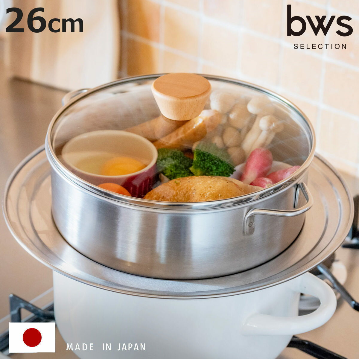 サイズ外寸:約 幅26×奥行20.7×高さ14(cm)内寸:約 高さ8.5(cm)内径:約 20(cm)重量約 770g内容量1セット(深型本体、ガラス蓋、内ざる)材質本体・ざる:ステンレス鋼ガラス蓋:強化ガラス、木(ウレタン塗装)生産国日本製生産国補足ガラス蓋のみ中国製食器洗い乾燥機部品によって使用不可注意事項※ガラス蓋は食洗機に対応していません。 ※商品ページ内には別の商品を含む画像を使用しています。 区分返品・キャンセル区分(小型商品)ギフトラッピングページを見るビーワーススタイル すっきり暮らす 蒸し器 26cm 深型 ガラス蓋付き 内ざる付き ステンレス製 せいろおすすめポイント※商品ページ内には別の商品を含む画像を使用しています。 せいろ初心者でも扱いやすいステンレス製せいろ【深型本体】【ガラス蓋】【内ざる】セット竹製せいろの風合いは魅力的ですが、「衛生面が心配」「お手入れが大変」「収納場所に困る」そんな声に応えて登場したのが、扱いやすいステンレス製せいろです。 初めての方でも気軽に蒸し料理を楽しめます。 ほったらかしで同時調理、時短でヘルシーな蒸し料理一度に複数の食材をまとめて調理でき、毎日のごはん作りを時短できます。 蒸すことで余分な油が落ち、素材のうまみを活かしたヘルシーな仕上がりになります。 クッキングシートなしで肉や魚を直接置ける食材を直接置いてもにおい移りしにくいです。 カビの心配がなく、丈夫で長持ち汚れに強く、サビに強いです。 竹製のようなカビの心配がなく、丈夫で長持ちします。 2段蒸しに便利なざる付き「深型」「深型」は専用のざる付きで、2段に分けて蒸すことも可能です。 茶碗蒸しや蒸しプリンなど高さのある容器も調理できます。 商品詳細洗剤で洗えて衛生的使い終わったら洗剤で丸洗いでき、衛生的に保てます。 食洗機にも対応しているので、お手入れの負担を大幅に軽減できます。 ※ガラス蓋は食洗機に対応していません。 食材の状態が見やすいガラス蓋蓋を開けずに中の様子を確認できて蒸しすぎを防ぎます。 ナチュラルな木製のつまみがアクセントになっています。 コンパクトに収納可能別売りの【仕切り板】と合わせて収納しても、場所を取らないコンパクトサイズです。 持ち上げやすい両手取っ手移動や持ち上げの際に便利な両手取っ手です。 スタイリッシュなワイヤータイプで、見た目もすっきりとした印象です。 シリーズ紹介浅型 ガラス蓋付き浅型 ガラス蓋・仕切り板付き深型 ガラス蓋・内ざる付き【▲このページの商品】深型 ガラス蓋・内ざる・仕切り板付き仕切り板関連キーワード:ステンレス製鍋 ステンレス鍋 蒸籠 調理鍋 鍋 なべ ふた付き ふたあり 丸型蒸し器 円形 大きい サイズ ザル ざる ストレーナー付き 調理用品 料理道具 台所用品 調理小物 キッチングッズ キッチンアイテム キッチン小物 キッチン雑貨 調理器具 キッチン用品 調理道具 実用的 おすすめ オススメ 便利 役立つ お洒落 おしゃれ オシャレ LH14776 LH11143 関連商品はこちら ビーワーススタイル すっきり暮らす 蒸し器 7,700円ビーワーススタイル すっきり暮らす 蒸し器 24,620円? ビーワーススタイル すっきり暮らす 蒸し器 4,620円 ビーワーススタイル すっきり暮らす 蒸し器 5,720円のせるだけで簡単蒸し器 24〜26cm ステン5,500円Vita Craft 大蒸し器 15,400円Vita Craft 小蒸し器 蓋つき 15,400円のせるだけで簡単蒸し器 28〜30cm ステン6,050円のせるだけで簡単蒸し器 20〜22cm ステン4,950円のせるだけで簡単蒸し器 18〜20cm ステン4,400円両手鍋 26cm IH対応 2段蒸し器 だんら4,500円蒸し器 24cm IH対応 燕三 二段蒸し器 11,000円 【レビュー特典付き】 ビーワーススタイル すっきり暮らす 蒸し器 26cm 深型 ガラス蓋付き 内ざる付き ステンレス製 せいろ ( 蒸し鍋 スチーマー 日本製 ザル付き 26センチ セイロ 両手鍋 ステンレス フタ付き 蒸し 野菜 茶碗蒸し )【3980円以上送料無料】 6,600 ~
