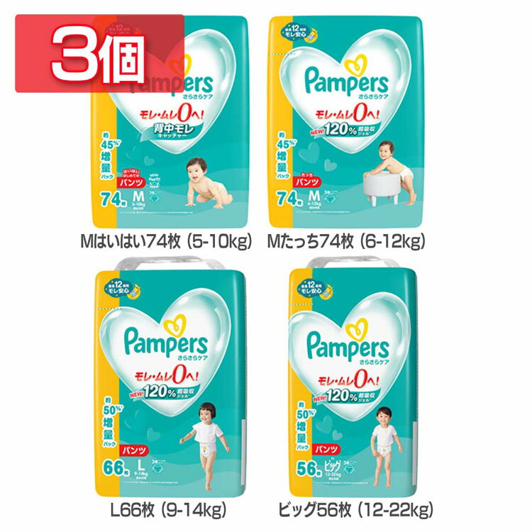 ※2024/6/3サイズと個数セットが統一されました※ 2025年6月18日 8個セットを削除しました。 ※リニューアルに伴いパッケージ・内容等予告なく変更する場合がございます。 予めご了承ください。 新技術!吸収スピード最大2倍*で、お肌さらさら**パンパース独自の「3つのマジック吸収体」で、分散して即吸収。 おしっこを肌によせつけず、最長12時間お肌さらさら。 *全サイズ内での最高値* *当社過去製品比較新技術!うすくなって、快適旧製品と比べて、約12%*うすくなりました。 しかも、おしっこしてもオムツがうすく快適で、一晩中ぐっすり眠れます。 *使用前の製品の厚さの比較もちろん、通気性はばっちり!全面通気のおむつでムレを逃がして赤ちゃんのお肌は快適。 やわらかコットンシート* 赤ちゃんのお肌を快適に包みます。 * “コットンシート”はコットンのような肌ざわりのシートです。 コットンは含まれていませんウエスト超ふわふわ革命新技術で、お腹まわりを締め付けずにやさしく包み込むおむつ最長12時間お肌さらさらで一晩中のゴールデンスリープ 赤ちゃんの成長にとって特別な、一晩中邪魔されない眠りをパンパースは「ゴールデンスリープ」と呼んでいます。 最長12時間お肌さらさらで一晩中のゴールデンスリープ独自のシートで2倍さらさら*独自の1枚多いさらさらシートで、おしっこもムレも肌によせつけません。 *独自のシートなしのパンパースとの比較もちろん、通気性ばっちり!コットンシート*ムレを逃がして赤ちゃんのお肌は快適。 * “コットンシート”はコットンのような肌ざわりのシートです。 コットンは含まれていませんモレ防止も最長12時間!パンパースの吸収力と、モレ防止ギャザーで、もちろんモレ安心!Sカーブで快適フィット遊びざかりの動きに合わせて伸び縮み自由自在。 ウエスト超ふわふわ革命お腹まわりを締め付けずにやさしく包み込みます。 1秒吸収*! モレ0へ! ALL NEW! おしっこ&ゆるうんちメッシュ *平均尿量に基づく(P&G調べ) 2回のおしっこを想定 ●商品サイズ(cm) 【はいはいM】幅23.2cm×高さ43.2cm×奥行12.3cm 【たっちM】幅23.2cm×高さ43.2cm×奥行12.3cm 【L】幅19.8cm×高さ43.6cm×奥行12.7cm 【ビッグ】幅17.4cm×高さ45.1cm×奥行13.1cm 【ビッグより大きい】幅29.4cm×高さ24.3cm×奥行13.8cm ●内容量 【はいはいM】 52枚 【たっちM】 52枚 【L】 44枚 【ビッグ】 38枚 【ビッグより大きい】 30枚 ●材質 表面材:ポリオレフィン不織布 吸収材:ポリエステル不織布、ポリオレフィン不織布、 綿状パルプ、高分子吸水材 防水材:ポリオレフィンフィルム 止着材:粘着テープ 伸縮材:合成ゴム 結合材:ホットメルト粘着材 ●原産国 日本 (検索用:パンパース オムツ おむつ 紙オムツ 紙おむつ Pampers ぱんぱーす パンパース パンツ パンパース Mたっち パンパース Mはいはい パンパース L パンパース ビッグ パンパース ビッグより大きい おしめ パンツタイプ パンパース さらさらケア 4987176136138/4987176136152/4902430148887/4902430148948/4987176076205) 最強翌日配送対象商品に関するご案内 最強翌日配送対象商品・対象地域に該当する場合は最強翌日配送マークがご注文カゴ近くに表示されます。 最強翌日配送可能なお支払方法は【クレジットカード、代金引換、全額ポイント支払い】のみとなります。 下記の場合は最強翌日配送対象外となります。 ・15点以上ご購入いただいた場合 ・時間指定がある場合 ・ご注文時備考欄にご記入がある場合 ・決済処理にお時間を頂戴する場合 ・郵便番号や住所に誤りがある場合 ・最強翌日配送対象外の商品とご一緒にご注文いただいた場合 ・お届け先住所文字数が40文字以上の場合 【4個セット】パンパース さらケアパンツ オムツ おむつ SJ はいはいM たっちM L ビッグ ビッグより大きい オムツ おむつ 紙オムツ 紙おむつ Pampers ぱんぱーす パンツ おしめ パンツタイプ パンパース 7,480 ~