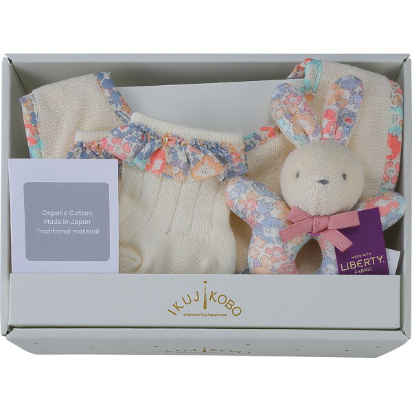 人気のリバティプリントを使用したスタイとラトルのギフトセットです。 専用ボックスに入った人気のモデルです。 サイズ ●現品(スタイ)約22×19cm、(ラトル)約19×12×4cm、(ソックス)約7?9cm 材質 ●スタイ:綿100%、ラトル:綿100%(中綿ポリエステル)、ソックス:綿81%・ポリエステル17%・ポリウレタン2% 内容 ●スタイ、ラトル、ソックス×各1●対象年齢:(スタイ)3ヶ月?、(ラトル)3ヶ月?●家庭洗濯可(手洗い) 【化粧箱入】 ※実店舗と在庫を共有しているため、ご注文頂きましても商品をご用意できない場合がございます。 発送までに10日程度お時間を頂く場合がございます。