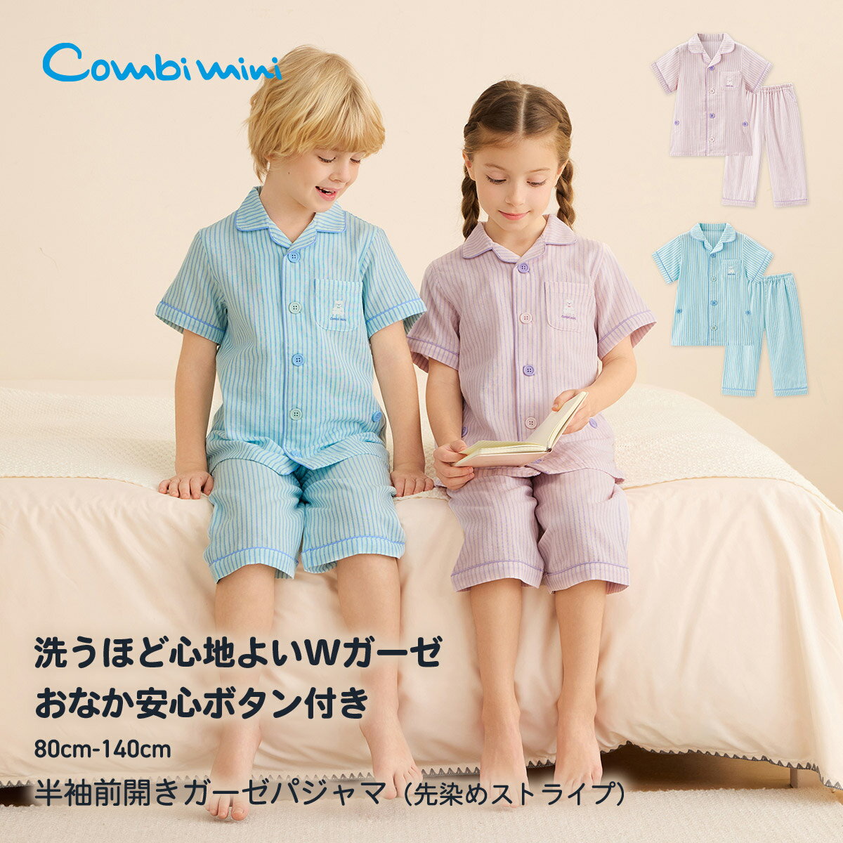 モデル身長:121cm 着用サイズ:120 モデル身長:119cm 着用サイズ:120 商品について 【素材】さらりとしたWガーゼ素材で、洗うほど肌に心地よく、通気性・吸水性も抜群でさらっとした肌触りをキープできます。 また、先染め素材ならではの風合いを洗うたびにお楽しみください。 【柄】コンビミニ定番の先染めガーゼパジャマシリーズに、涼し気なパステルカラーのストライプ柄が登場。 シーズン問わず男女ともにおススメで、同素材同柄のママ用パジャマや新生児&ベビーサイズのべビさらオールもご用意しています。 親子や兄弟姉妹でのお揃いが楽しめます。 また、お客様の声にお答えして同柄同素材の150cmジュニアサイズパジャマを「コンビミニ公式ストア」にて先行販売しております。 是非ご覧くださいませ。 (ママパジャマ品番667254/べビさらオール品番667256/150cmジュニアサイズパジャマ品番667270) 【仕様】上質感のある前開き襟付き仕様。 コードパイピングとポケットの白いテディベア刺繍がアクセントになっています。 (ママサイズはポケット左上部分に刺繍が入ります。 )コンビミニのパジャマは一人でお着替えの練習ができる工夫が満載。 かけ違いを防ぐ配色ボタン&ホール。 大き目のボタンで掴みやすく留めやすい斜めボタンホール。 前後がわかりやすいBACKマーク付き。 また、上下をつなぐおなかのはみ出しを防ぐ脇ボタンもうれしい機能(おなか安心ボタン) 【備考】ボトム7分丈、110?140サイズはボタン5個、BACKマーク(ボトムのみ)、おなか安心ボタン、ウエストゴム替え口付き、商品によって柄の出方が異なります。 【ポケット】あり 【伸縮性】あり 【透け感】透けない 【クリーニング】洗濯機洗い可 【裏地】なし モニター・環境等により実際の商品と色味が多少異なって表示される場合がございます。 また、生産時期により色味が若干異なる場合がございます。 予めご了承ください。 素材綿100%(Wガーゼ、ブロード) カラー展開 ライトピンク、ライトグリーン サイズ展開 80、90、100、110、120、130、140 サイズについて 80トップス身幅:30cm/トップス着丈:38cm/トップス裄丈:21cm/パンツヒップ幅:32cm/パンツ総丈:34.5cm/パンツ股下:16cm90トップス身幅:32cm/トップス着丈:40cm/トップス裄丈:23cm/パンツヒップ幅:32cm/パンツ総丈:39.5cm/パンツ股下:20cm100トップス身幅:34cm/トップス着丈:43cm/トップス裄丈:25cm/パンツヒップ幅:34cm/パンツ総丈:43.5cm/パンツ股下:24cm110トップス身幅:36cm/トップス着丈:46cm/トップス裄丈:27cm/パンツヒップ幅:35.9cm/パンツ総丈:47.5cm/パンツ股下:28cm120トップス身幅:38cm/トップス着丈:49cm/トップス裄丈:29cm/パンツヒップ幅:37.9cm/パンツ総丈:52.5cm/パンツ股下:32cm130トップス身幅:40cm/トップス着丈:52cm/トップス裄丈:31cm/パンツヒップ幅:39.9cm/パンツ総丈:56.5cm/パンツ股下:36cm140トップス身幅:42cm/トップス着丈:55cm/トップス裄丈:33cm/パンツヒップ幅:41.9cm/パンツ総丈:61.5cm/パンツ股下:40cmベビー服サイズの選び方 >> ブランドについて Combiminiベビー服は、大切な赤ちゃんが初めてみにつけるものだから。 コンビミニは「本当にいいもの」を身につける喜びをベビーとママ、パパにお届けしたいと願っております。 長年赤ちゃんを見つめてきたベビー用品総合メーカーとして、培ってきた「赤ちゃん工学」をフル活用し、着ごこち、動きやすさ、着せやすさなど、あらゆる面にこだわりを一つ一つ丁寧に仕上げています。 ベビーがたくさん笑ってくれるような服を、これからもお届けします。 ギフトラッピングをご希望の方 >> 《コンビミニ》おなか安心ボタン付き半袖前開きガーゼパジャマ(先染めストライプ) : 女の子 男の子 80cm 90cm 100cm 110cm 120cm 130cm 140cm | ベビー 服 キッズ 子供 夏 ルームウェア こども 子ども 部屋着 寝巻き 保育園 綿100 Wガーゼ おそろい【パジャマ】 3,646 ~