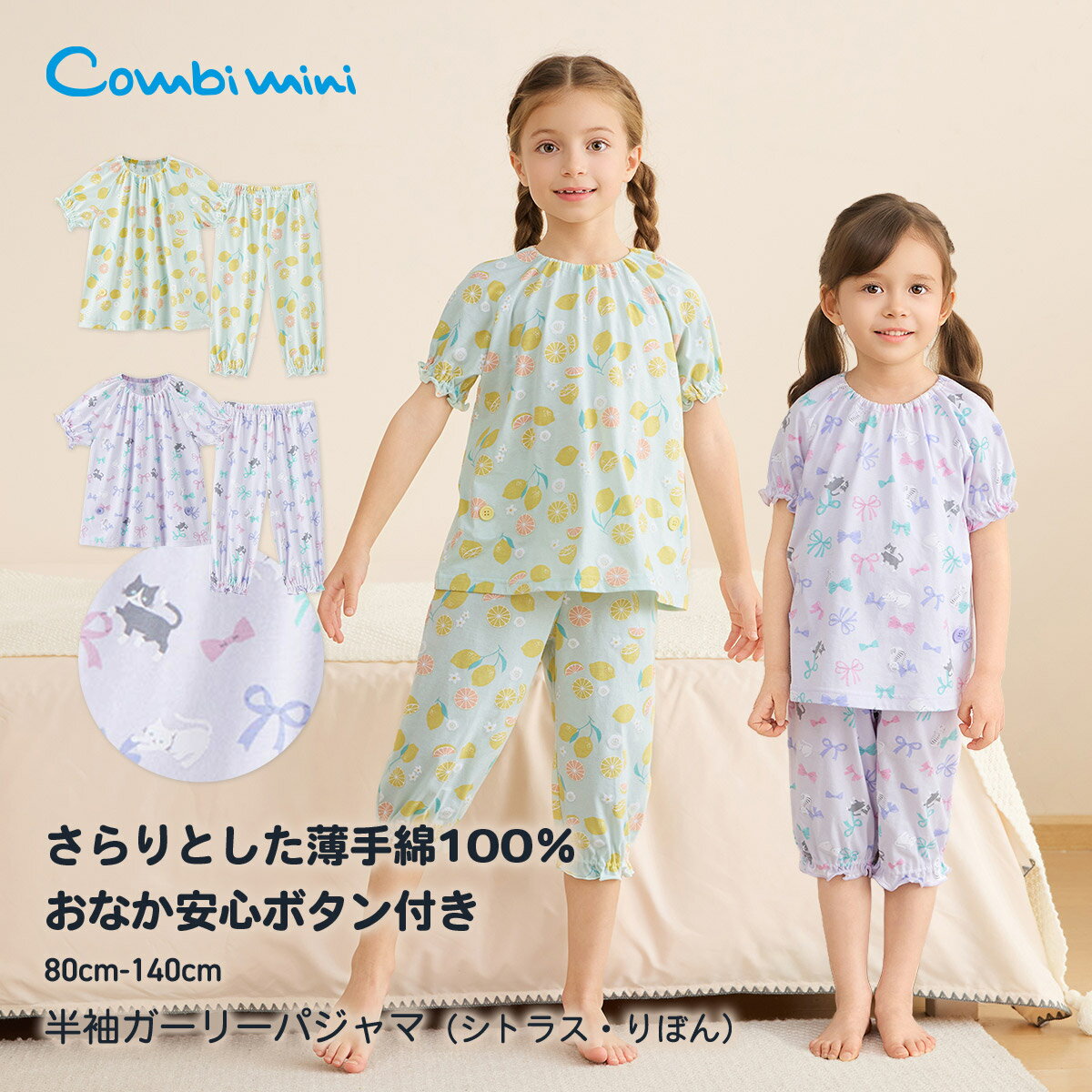 モデル身長:121cm 着用サイズ:120 モデル身長:121cm 着用サイズ:120 モデル身長:99cm 着用サイズ:100 商品について 【素材】蒸し暑い夏の夜でもさらっとした肌ざわりで、洗濯を繰り返しても型崩れしにくい綿100%の薄手天竺素材を使用。 【柄】ライトグリーンは、レモンをメインにしたシトラスをさわやかな色合いで表現した総柄です。 地の色にシトラスの黄色が映え、華やかな印象に仕上げました。 ラベンダーは、散りばめられたカラフルなリボンの間に、主張しすぎないようにモノトーンで表現したネコたちをさりげなく配置したラブリーでかわいらしい総柄で、ネコが大好きなキッズにピッタリです。 【仕様】衿、袖口、パンツ裾のギャザーでふんわりとしたシルエットが女の子らしさ引き立てます。 袖口と裾ゴムの裏にはゴムが直接肌に当たらない工夫がされています。 また、トップスがめくれておなかが冷えることを防ぐ、おなか安心ボタン付きです。 【備考】【備考】BACKマーク、おなか安心ボタン、ウエストゴム替え口付き、襟ぐり・袖口・裾口ゴム仕様 【ポケット】なし 【伸縮性】あり 【透け感】透けない 【クリーニング】洗濯機洗い可 【裏地】なし モニター・環境等により実際の商品と色味が多少異なって表示される場合がございます。 また、生産時期により色味が若干異なる場合がございます。 予めご了承ください。 素材綿100%(SZ天竺) カラー展開 ライトグリーン、ラベンダー サイズ展開 80、90、100、110、120、130、140 サイズについて 80トップス身幅:34.3cm/トップス着丈:34cm/トップス裄丈:21cm/パンツヒップ幅:30.3cm/パンツ総丈:33cm/パンツ股下:14.5cm90トップス身幅:36.3cm/トップス着丈:36cm/トップス裄丈:23cm/パンツヒップ幅:30.3cm/パンツ総丈:37.5cm/パンツ股下:18cm100トップス身幅:38.3cm/トップス着丈:39cm/トップス裄丈:25cm/パンツヒップ幅:32.3cm/パンツ総丈:41cm/パンツ股下:21.5cm110トップス身幅:40.3cm/トップス着丈:42cm/トップス裄丈:27cm/パンツヒップ幅:34.3cm/パンツ総丈:45.5cm/パンツ股下:25cm120トップス身幅:42.3cm/トップス着丈:45cm/トップス裄丈:29cm/パンツヒップ幅:36.3cm/パンツ総丈:49.5cm/パンツ股下:29cm130トップス身幅:44.3cm/トップス着丈:48cm/トップス裄丈:31cm/パンツヒップ幅:38.3cm/パンツ総丈:54.5cm/パンツ股下:33cm140トップス身幅:46.3cm/トップス着丈:51cm/トップス裄丈:33cm/パンツヒップ幅:40.3cm/パンツ総丈:58.5cm/パンツ股下:37cmベビー服サイズの選び方 >> ブランドについて Combiminiベビー服は、大切な赤ちゃんが初めてみにつけるものだから。 コンビミニは「本当にいいもの」を身につける喜びをベビーとママ、パパにお届けしたいと願っております。 長年赤ちゃんを見つめてきたベビー用品総合メーカーとして、培ってきた「赤ちゃん工学」をフル活用し、着ごこち、動きやすさ、着せやすさなど、あらゆる面にこだわりを一つ一つ丁寧に仕上げています。 ベビーがたくさん笑ってくれるような服を、これからもお届けします。 ギフトラッピングをご希望の方 >> 《コンビミニ》おなか安心ボタン付き半袖ガーリーパジャマ(シトラス・りぼん) : 女の子 80cm 90cm 100cm 110cm 120cm 130cm 140cm | ベビー 子供服 子ども こども キッズ 綿100% コットン 天竺 ルームウェア 上下 春 夏 シトラス リボン【パジャマ】 3,272 ~