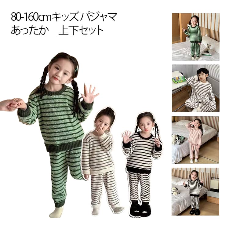 もこもこふわふわの柔らかい生地を使用した上下セットパジャマで、快適な着心地と保温性を実現。 秋冬向けの暖かい素材で、寒さ対策にぴったりの室内着として活躍。 ストライプ柄のおしゃれな上下セットで、リラックスタイムを楽しく演出。 袖口のゴム締めが冷風侵入を防ぎ、保温性を高めると同時に、統一感のある柄でお子様の好みに合う可愛い印象を与える。 サイズ 80 90 100 110 120 130 140 150 160 サイズについての説明 80 身長参考(73-80cm) 体重参考(7.5-9.5kg) 90 身長参考(80-90cm) 体重参考(9.5-12.5kg) 100 身長参考(90-100cm) 体重参考(12.5-15kg) 110 身長参考(100-110cm) 体重参考(15-17.5kg) 120 身長参考(110-120cm) 体重参考(17.5-20kg) 130 身長参考(120-130cm) 体重参考(25-28.5kg) 140 身長参考(130-140cm) 体重参考(28.5-32.5kg) 150 身長参考(140-150cm) 体重参考(32.5-36.5kg) 160 身長参考(150-160cm) 体重参考(36.5-40kg) ※測定方法によって誤差が生じますので、予めご了承下さい。 素材 ポリエステル 色 グレー(上下セット) グリーン(上下セット) ピンク(上下セット) ブラック(上下セット) 備考 ●サイズ詳細等の測り方はスタッフ間で統一、徹底はしておりますが、実寸は商品によって若干の誤差(1cm〜3cm )がある場合がございますので、予めご了承ください。 ●商品の色は、撮影時の光や、お客様のモニターの色具合などにより、実際の商品と異なる場合がございます。 あらかじめ、ご了承ください。 ●製品によっては、生地の特性上、洗濯時に縮む場合がございますので洗濯時はご注意下さいませ。 ▼色味の強い製品によっては他の衣類などに色移りする場合もございますので、速やかに(脱水、乾燥等)するようにお願いいたします。 ▼生地によっては摩擦や汗、雨などで濡れた時は、他の製品に移染する恐れがございますので、着用の際はご注意下さい。 ▼生地の特性上、やや匂いが強く感じられるものもございます。 数日のご使用や陰干しなどで気になる匂いはほとんど感じられなくなります。