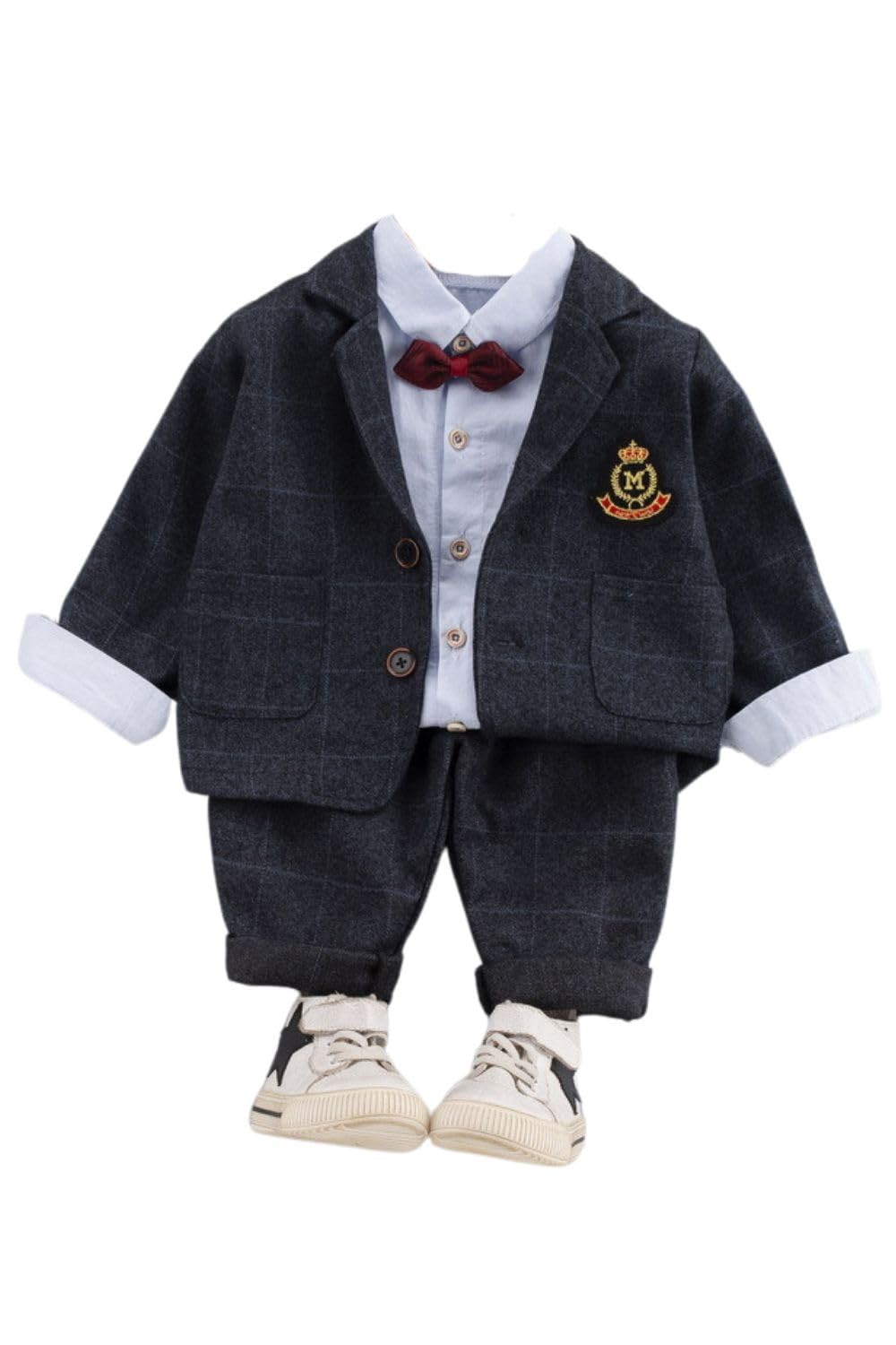 商品情報商品の説明主な仕様 【3シーズンしっかり使える/フォーマルイベントに活躍】お出かけに気軽におしゃれを楽しめるフォーマルジャケットの付いた上下セットアップ。 チェック柄がキュートでインパクト絶大なので可愛くファッションを楽しめるのはGOOD。 届いたその日からコーデが楽しめる3点セット。 【可愛いシルエットで着心地&動きやすさも抜群】生地が丈夫なのでたくさん動く活発なお子さまにもGOOD!上下セットアップのシルエットはカッコよく、柔らかい生地ながらもフォーマルな雰囲気が出ます。 ジャケット・パンツ・長袖シャツを別々で使っても良し、お得な3点セットです【シンプルかつ飽きのこないデザイン】卒園式、入学式、結婚式、パーティなどお出かけの日はもちろん、さまざまなフォーマルシーンで活躍します。 兄弟でお揃いにしたり、お友達同士でのリンクコーデにもおすすめです。 【コーディネイト例】 上下セットアップなので届いたその日から着こなしOK/お手持ちのジャケットやアウターと合わせた寒い日コーデ/ジャケットは使わずにシャツとパンツ、フォーマルな靴と帽子を合わせた暑い日コーデ など【サイズ】80cm、90cm、100cm、110cm、120cm ■80 size:推奨身長 75-85、着丈 36、バスト 31、パンツ丈 46 ■90 size:推奨身長 85-95、着丈 38、バスト 32.5、パンツ丈 51 ■100 size:推奨身長 95-105、着丈 40、バスト 34、パンツ丈 56 ■110 size:推奨身長 105-115、着丈 42、バスト 35.5、パンツ丈 61 ■120 size:推奨身長 115-125、着丈 44、バスト 37、パンツ丈 66 【送料無料】[EnDast] フォーマル 3点セット セットアップ 蝶ネクタイ チェック柄ジャケット 長袖シャツ パンツ 発表会 結婚式 パーティ ベスト 韓国子供服 キッズ服 ベビー服 男の子 80cm 90cm 100cm 110cm 120cm 色:ネイビー、サイズ:80 5,131 ~