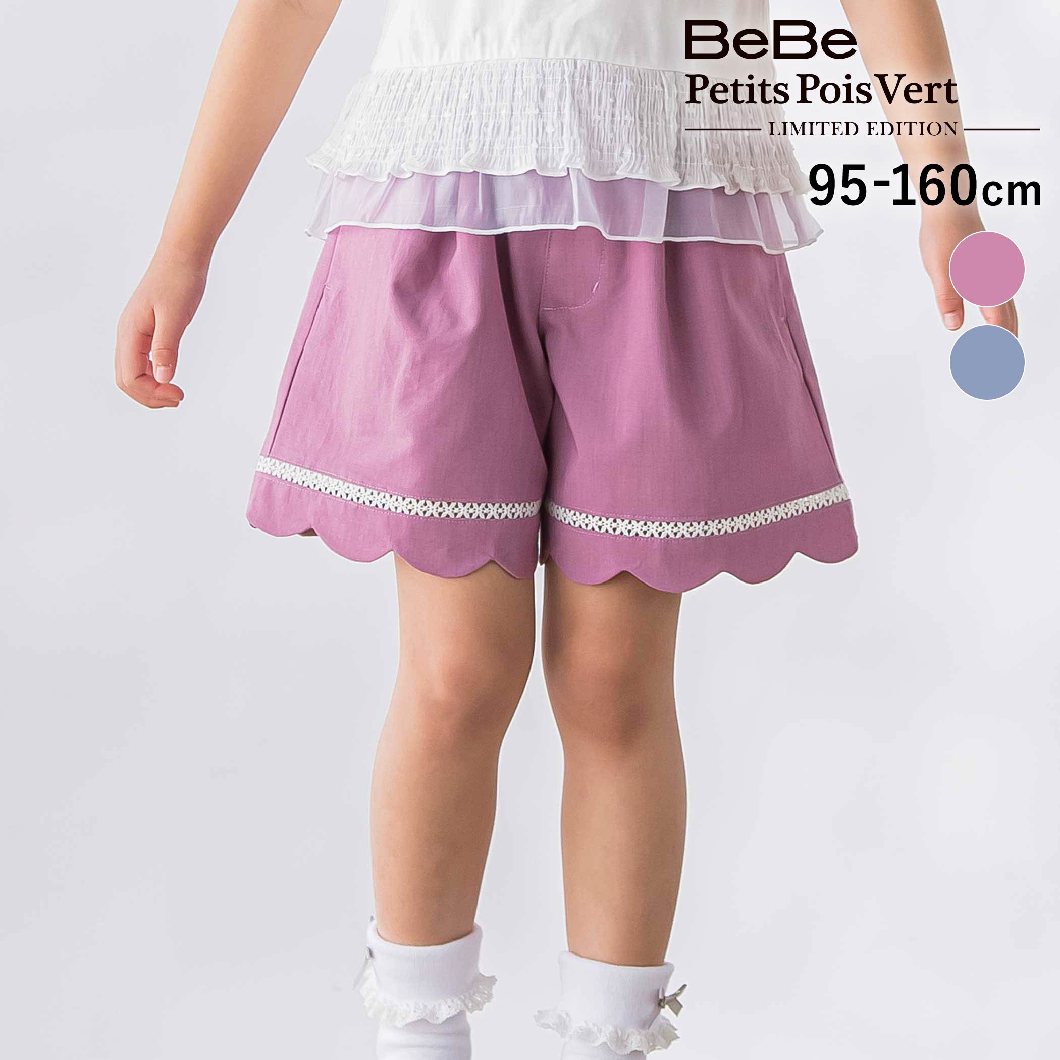 商品名 BeBe Petits Pois Vert【限定商品】裾はしごレースキュロット(95〜160cm) 商品番号 1210-82059 商品説明 -26SS-スカラップ×はしごレースが可愛い。 軽やかに穿けるガーリーショートパンツ。 ■デザイン裾に施したスカラップデザインとはしごレースが、女の子らしさを引き立てるショートパンツ。 ふんわり広がるラインが軽やかで、どんなトップスと合わせてもガーリーなコーデが完成します。 ウエストにはきらりと光る小さなチャームを添えて、さりげないアクセントに。 カラーは深みのある色合いが楽しめるブルーとパープルの2色展開で、上品さと可愛さを両立した仕上がりです。 ■素材/機能布帛素材を使用し、さらっとした肌触りで汗ばむ季節でも快適な着心地。 軽くて風通しが良く、動きやすいため、アクティブなシーンにもおすすめです。 深みのある発色が特徴の“双色生地”を使うことで、シンプルになりすぎず上質な雰囲気に。 ウエストは総ゴム仕様で、着脱もらくちんです。 デザイン性と実用性を兼ね備えた、夏にうれしい1本です。 ▼おすすめコーデ1215-82100:Tシャツ※ウエスト裏にゴム調節口あり。 ※両脇ポケットあり。 26春夏アイテム【BeBe Petits Pois Vert (べべ・プチポワヴェール)】ディティールと素材にこだわり*今着たい*トレンドアイテムと*合わせやすい*スタンダードアイテムで素敵なコーディネートをご提案お子様がワクワクドキドキする毎日をお届けします。 【BeBe Petits Pois Vert LIMITED EDITION】「着せたい」と思った服を子ども自身が選んで着てくれるそれが大人の一番の喜びだから子どもが「着たい!」と思える服づくりにこだわりました。 限定店舗だけで特別に発売されるリミテッドエディションにご注目ください。 素材 (本体)ポリエステル70% レーヨン24% ポリウレタン6% (部分使)ポリエステル80% 綿20% 実寸 95cm:ウエスト21 パンツ丈26.5 裾幅23.5 わたり幅25.5100cm:ウエスト22 パンツ丈28.5 裾幅24 わたり幅25.5110cm:ウエスト23 パンツ丈30.5 裾幅25 わたり幅26.5120cm:ウエスト24 パンツ丈33.5 裾幅26 わたり幅28130cm:ウエスト25.5 パンツ丈36.5 裾幅27.5 わたり幅29.5140cm:ウエスト27 パンツ丈39.5 裾幅28.5 わたり幅31.5150cm:ウエスト28 パンツ丈42.5 裾幅30 わたり幅33160cm:ウエスト29 パンツ丈45.5 裾幅31.5 わたり幅34.5 ブランド BeBe Petits Pois Vert カラー ブルー,パープル 原産国 中国 製造元 株式会社べべ(BEBE) メーカー希望小売価格はメーカー商品タグに基づいて掲載しています ▼カテゴリーから探す▼ 最大1000円OFFクーポン/【SALE 10%OFF】BeBe Petits Pois Vert 【限定商品】裾はしごレースキュロット(95〜160cm) 子供服 女の子 キッズ ギフト ブランド プレゼント 半ズボン 幼稚園 小学生 高学年 ジュニア服 95cm 100cm 110cm 120cm 130cm 140cm 150cm 160cm 4,455 ~