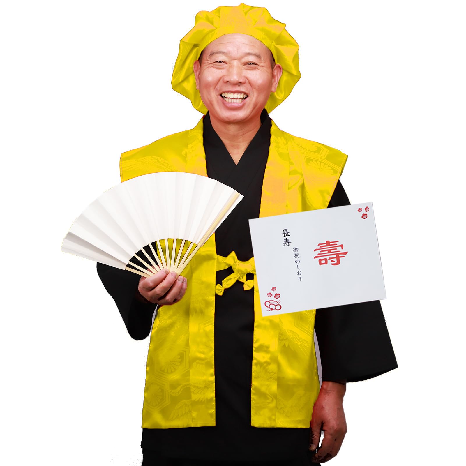 商品情報商品の説明主な仕様 セット内容:大黒頭巾、黄のちゃんちゃんこ、末広(扇子)、栞、化粧箱の計5点。 (弊店のストアーでは、バルーン付/バルーン無しの3種類の商品があります、必ずご確認の上、ご購入をお願い致します。 )サイズ:ちゃんちゃんこ:フリーサイズ(着丈:約 74cm 身幅:約60cm 肩幅:約54cm 紐:約28cm)/帽子:フリーサイズ(幅:約34cm)/扇子:高さ:約28cm.男女兼用 ・どなたでも着用いただきやすいフリーサイズで、ご夫婦で代わるご着用いただくことも可能です。 紐でサイズ調整をしてください。 品質:頭巾、ちゃんちゃんこ:ポリエステル100%。 扇子:竹、和紙。 ちゃんちゃんこと頭巾の生地に、縁起のよい「鶴」と「亀甲文」の文様が入っており、上品な光沢感と共に、高級感あふれる仕上がりです。 扇子は縁起の良い末広がりの白扇子です。 簡単にご説明いたしました「御祝いの栞」も同封いたします。 用途:豪華な化粧箱に入ってお届けいたしますので、プレゼントに最適です。 還暦祝いの時の記念写真撮影用にピッタリな基本セットです。 感謝の気持ちを込めて、ご両親・ご祖父母・友人・上司など、大切な方へのちょっとしたプレゼントとしてご利用ください。 ご注意:・洗濯時、ちゃんちゃんこ・帽子は洗濯ネットを使用してください。 蛍光漂白剤は使用できません。 干す際は、日陰で釣り干ししてください。 アイロンがけは、あて布を使用してください。 ・商品によってサイズが若干前後する場合がございます。