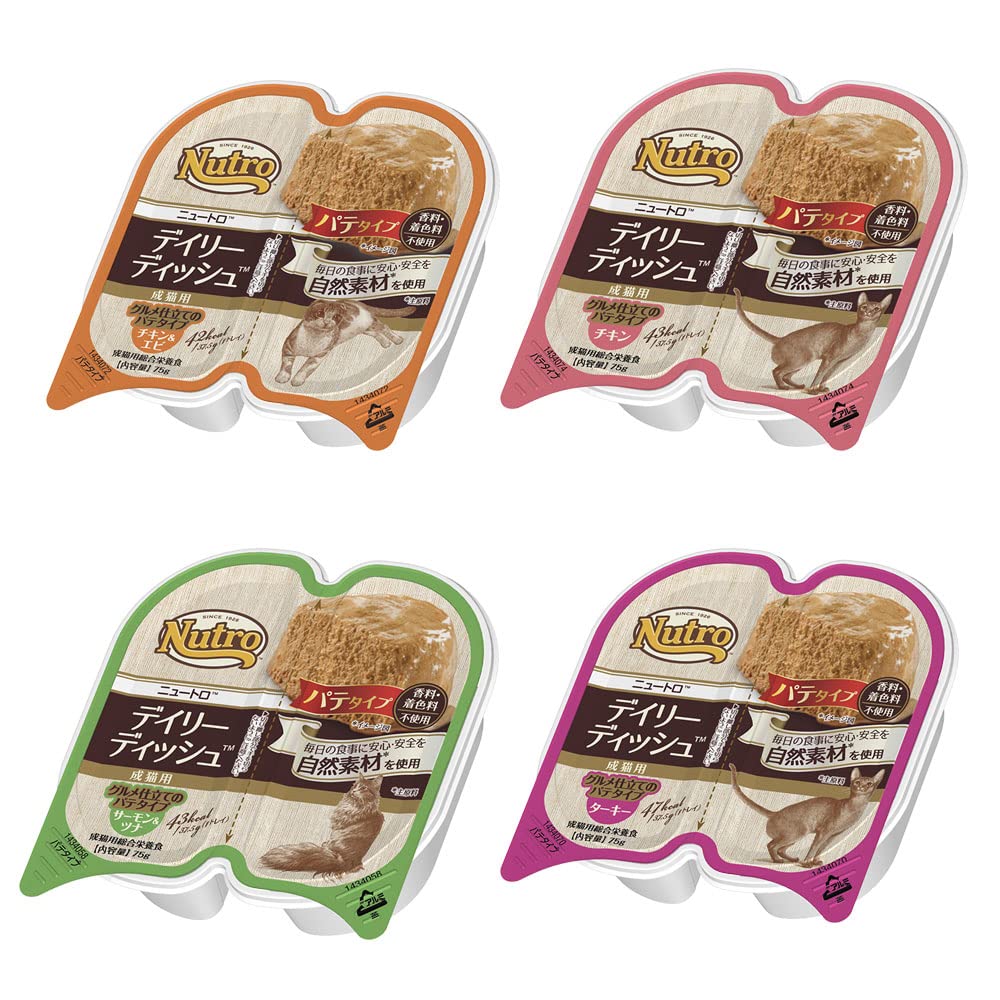 商品情報商品の説明開けるたび、おいしさ広がる!贅沢4種のアソートセット! アソート ニュートロ キャット デイリー ディッシュ 成猫以上用 トレイ 75g 4種4個 対象 猫 タイプ ウェットフード 機能 総合栄養食 ライフステージ 成猫以上 特長 ●高品質な肉などの、厳選自然素材がうれしい、成猫以上用の総合栄養食です。 ●猫が喜ぶ、抜群のおいしさです。 肉食の猫のためにお肉たっぷりです。 ●チキンまたはサーモンを第一主原料に使用し、穀物フリーです。 ●小分けパックで毎食新鮮です。 猫の一食分にちょうどいい、少量使いきりタイプです。 (37.5gx2食) ●水とデイリーディッシュだけで愛猫が毎日必要な栄養がきちんととれる、栄養バランスに優れた総合栄養食です。 ●毎日の食事にすることで、尿路の健康維持に配慮しました。 (毎日の食事から水分補給)。 セット内容 ●ニュートロ キャット デイリー ディッシュ 成猫用 チキン グルメ仕立てのパテタイプ トレイ 37.5gx2パック(75g) ●ニュートロ キャット デイリー ディッシュ 成猫用 チキン&エビ グルメ仕立てのパテタイプ トレイ 37.5gx2パック(75g) ●ニュートロ キャット デイリー ディッシュ 成猫用 サーモン&ツナ グルメ仕立てのパテタイプ トレイ 37.5gx2パック(75g) ●ニュートロ キャット デイリー ディッシュ 成猫用 ターキー グルメ仕立てのパテタイプ トレイ 37.5gx2パック(75g) 原材料 ●チキンチキン、鶏レバー、肉エキス、フィッシュオイル、ビタミン類、ミネラル類、アミノ酸類、増粘安定剤(グアーガム) ●チキン&エビチキン、鶏レバー、エビ、肉エキス、フィッシュオイル、ビタミン類、ミネラル類、アミノ酸類、増粘安定剤(グアーガム) ●サーモン&ツナサーモン、チキン、鶏レバー、ツナ、肉エキス、フィッシュオイル、ビタミン類、ミネラル類、アミノ酸類、増粘多糖類●ターキーターキー、鶏レバー、チキン、肉エキス、フィッシュオイル、ビタミン類、ミネラル類、アミノ酸類、増粘安定剤(グアーガム) 成分(共通) 【チキン、サーモン&ツナ】タンパク質:11.5%以上、脂質:6.0%以上、粗繊維:1.0%以下、灰分:3.0%以下、水分:78.0%以下【チキン&エビ】タンパク質:11.5%以上、脂質:5.5%以上、粗繊維:1.0%以下、灰分:3.0%以下、水分:78.0%以下【ターキー】タンパク質:11.5%以上、脂質:7.0%以上、粗繊維:1.0%以下、灰分:3.0%以下、水分:78.0%以下 カロリー ●チキン、サーモン&ツナ:43kcal/1トレイ ●チキン&エビ:42kcal/1トレイ ●ターキー:47kcal/1トレイ 生産国 アメリカ ご注意 ※対象年齢以外の猫には与えないでください。 ※開封後は冷蔵保管し、なるべく早く与えてください。 主な仕様 【送料無料】ニュートロ キャット デイリー ディッシュ 成猫以上用 トレイ 75g 4種各1個 お一人様5点限り 3,676 ~