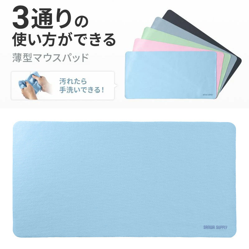 マウスパッドとしても使用できるが、ノートパソコンに挟んで持ち運びが可能で、ノートパソコンの液晶保護にもなる。 クリーニングクロスとしても使用できる3WAYのマウスパッド。 <特長>●スムーズな操作が可能でマウスソールにも優しいソフトな表面素材です。 ●薄型でノートパソコンに挟んで持ち運べます。 (13.3〜14インチ対応)●パソコンの持ち運び時にキーボードと画面の接触による傷を防ぎます。 ●クリーニング効果があり液晶画面クリーナーとしても使えます。 ●裏面は滑り止め効果の高いシリコンドット加工です。 ●汚れたら洗濯可能です。 (優しく中性洗剤で手洗い)<仕様>■カラー:ブルー■材質:表面/ポリエステル、マイクロファイバー(ポリエステル)裏面/シリコン、シリコンドット加工■大きさ:大型■薄型:○(0.5mm以下)■サイズ:約W285×D150×H0.5mm■重量:約14g■保証期間:初期不良のみ■対応機種:13.3〜14型ワイドのノートパソコン<関連キーワード>ノートパソコン用3WAYマウスパッド ブルー MPD-NOTE3BL 4969887370797色ちがいブラックブルーグリーングレーピンク マウスパッド パソコン液晶保護 クリーニングクロス 3WAY 超薄型 ノートパソコン すべり止め 手洗い可能 ブルー MPD-NOTE3BL サンワサプライ 1,330 ~