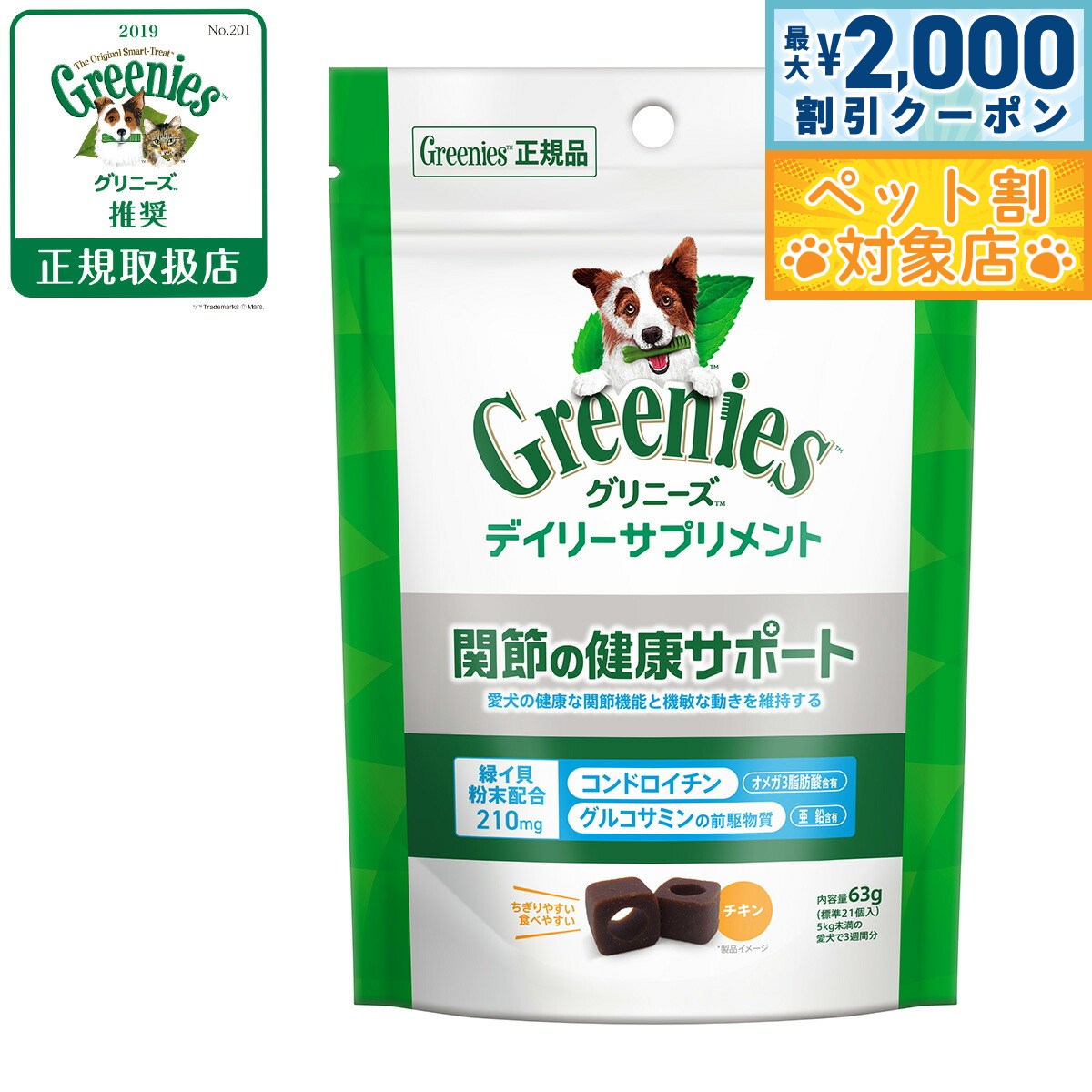 【最大2000円OFFクーポン!&店内ポイント最大62倍!本日限定!】グリニーズ デイリーサプリメント 関節の健康サポート 63g チキン味 成犬用 無添加 1,390 ~