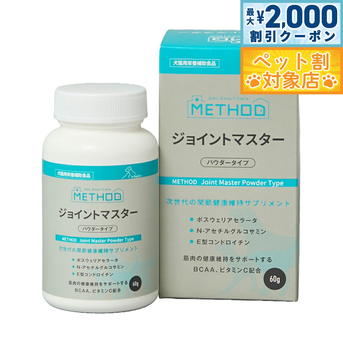 ボスウェリアセラータ、N-アセチルグルコサミン、E型コンドロイチン、筋肉の健康維持をサポートするBCAA、ビタミンC配合。 犬猫用栄養補助食品商品名METHOD サプリメント ジョイントマスター パウダータイプブランドQIX原材料麦芽糖、デキストリン、N-アセチルグルコサミン、チキンエキス、イカ軟骨抽出物末(コンドロイチン含有)、ボスウェリアセラータ樹脂抽出物末、柚子抽出物、ビタミンC、L-ロイシン、微粒酸化ケイ素、L-バリン、L-イソロイシン、グリセリン脂肪酸エステル、香料(えび由来)、甘味料(アスパルテーム・L-フェニルアラニン化合物)、酵素処理ヘスペリジン使用期限製造から2年カロリー314kcal以上/100g生産国日本 毎日のケアが、ペットの健康をつくります。 METHODが目指すのは、シンプルなのにうちの子に合ったケア。 エビデンスに基づいたケア。 愛情にあふれ、ペットとの最高の関係をつくり、大切な時間をもっと長くするためのケアで、日本の動物病院の半数以上が採用している確かな品質で、家族と動物病院を結びます。 科学的根拠や実証データに基づき、人や動物での機能や安全性が認められた成分を厳選して製品開発をおこなっています。 国内製造にこだわり、製法はシンプルに、原料は由来まで追求する、ペットと飼い主が安心して続けられる製品を作り続けています。 ペットのスムーズな歩行をサポート。 次世代の関節健康維持サプリメント。 バランスの取れた関節3成分に筋肉の健康維持成分を新配合・BCAA配合:体の中では主に筋肉や血液中に含まれ、筋肉の健康を維持するのに重要な栄養成分・ビタミンC配合:関節の健康維持に重要な働きをしています。 ・ボスウェリアセラータ:インドなどに自生するカンラン科ボスウェリア属の植物でボスウェリア酸が含まれている天然の成分・E型コンドロイチン:従来のサメやブタ由来とは異なるイカ由来のコンドロイチン・N-アセチルグルコサミン:グルコサミンの体内変換型で、グルコサミンの約3倍の利用率1日あたりの給与量:犬猫の体重5kgあたり2gを目安に、直接与えるか食事に混ぜて与えてください。 付属のスプーンは約1gです。 保存及び取扱いの注意:高温多湿・直射日光を避けて保存してください。 小児の手の届かないところに保管してください。 本製品は犬・猫専用です。 賞味期限を過ぎた製品は与えないでください。 主成分:2g中、イカ軟骨抽出物末(コンドロイチン含有)20mg、ボスウェリアセラータ樹脂抽出物末 10mg、N-アセチルグルコサミン 65mg、BCAA(L-バリン35mg、L-ロイシン65mg、L-イソロイシン35mg)、ビタミンC 335mg保証分析値:粗たん白質 7.2%以上、粗脂肪 1.6%以上、粗繊維 0.2%以下、粗灰分 2.4%以下、水分 10.0%以下対象ペット:犬、猫メーカー名株式会社 QIXMETHOD サプリメント ジョイントマスター パウダータイプボスウェリアセラータ、N-アセチルグルコサミン、E型コンドロイチン、筋肉の健康維持をサポートするBCAA、ビタミンC配合。 犬猫用栄養補助食品 【最大2000円OFFクーポン!&店内ポイント最大58倍!本日限定!】メソッド METHOD サプリメント ジョイントマスター パウダータイプ 60g 関節 粉 ふりかけ 3,080 ~