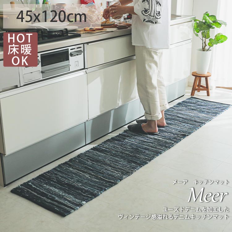 キッチンマットロングマットマット綿綿100%オシャレオルテガ西海岸デニム風ヴィンテージデニム風無地オールシーズンホットカーペット対応<メーアキッチンマット/約45x120cm>