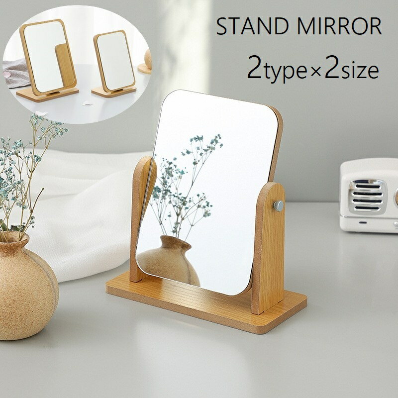 送料無料卓上ミラースタンドミラー化粧鏡メイクアップミラー木製机上360度回転長方形スクエアシンプルナチュラル北欧風