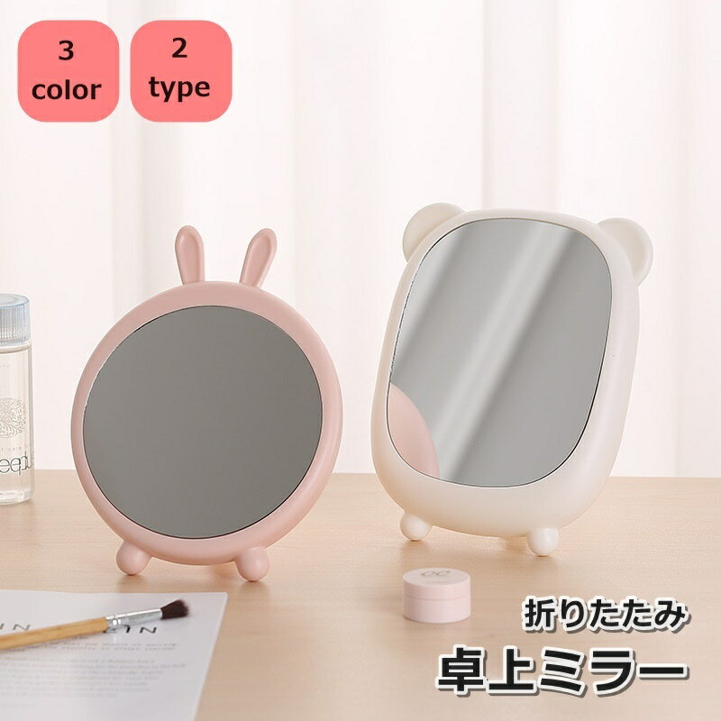 送料無料卓上ミラー折りたたみ化粧鏡インテリア雑貨耳付きウサギクマかわいいおしゃれ身だしなみメイクミラー