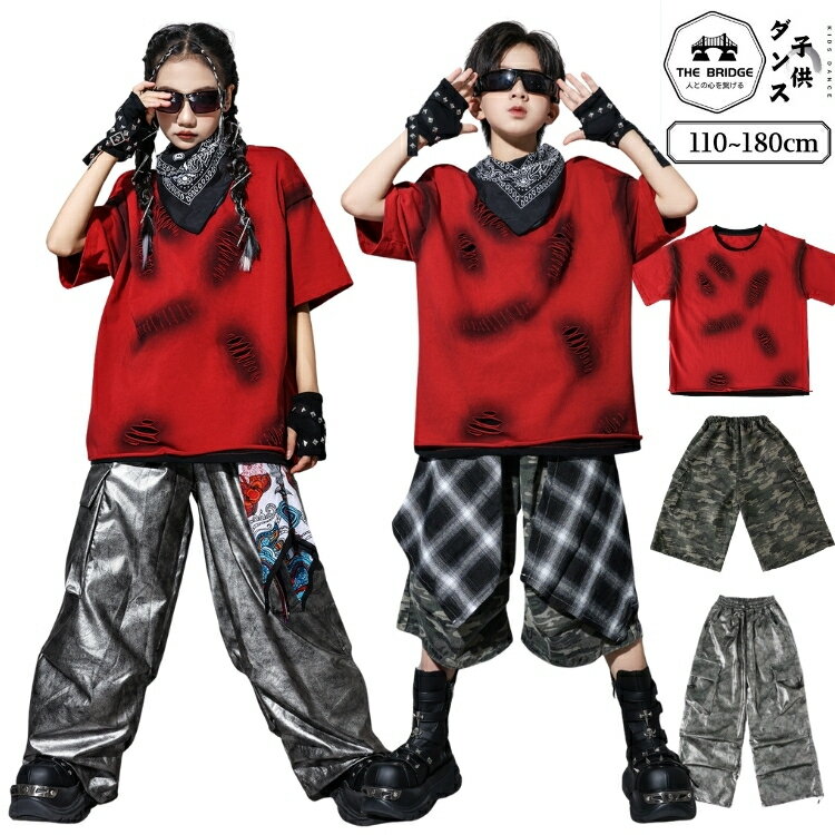 迷彩柄腰巻風キッズダンス衣装赤シルバーカーキグリーンかっこいい個性韓国おしゃれ女の子男の子ダンス衣装セットアップ子供服ヒップホップTシャツパンツキッズファッションストリートステージ衣装派手HIPHOPjazz練習着舞台服演出服110-180