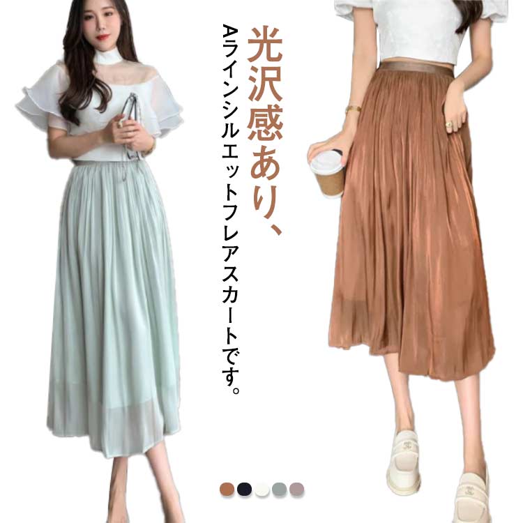 光沢スカートロングスカートミモレスカートスカートミモレ丈フレアスカート膝下ハイウェストAラインスカート春夏つや感ゆったり着痩せSMLXL