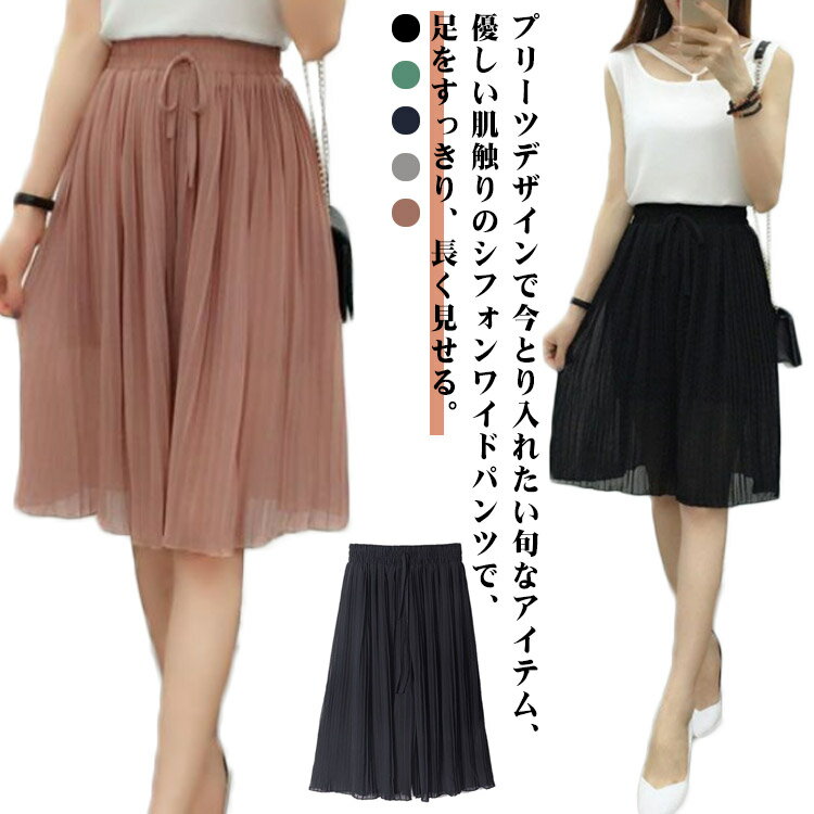 プリーツパンツ夏ハーフパンツレディース膝下ガウチョパンツシフォンパンツワイドパンツキュロットパンツ通勤スカーチョ薄手普段着透け感夏無地おしゃれ20代30代40代50代SMLXL2XL3XL4XL