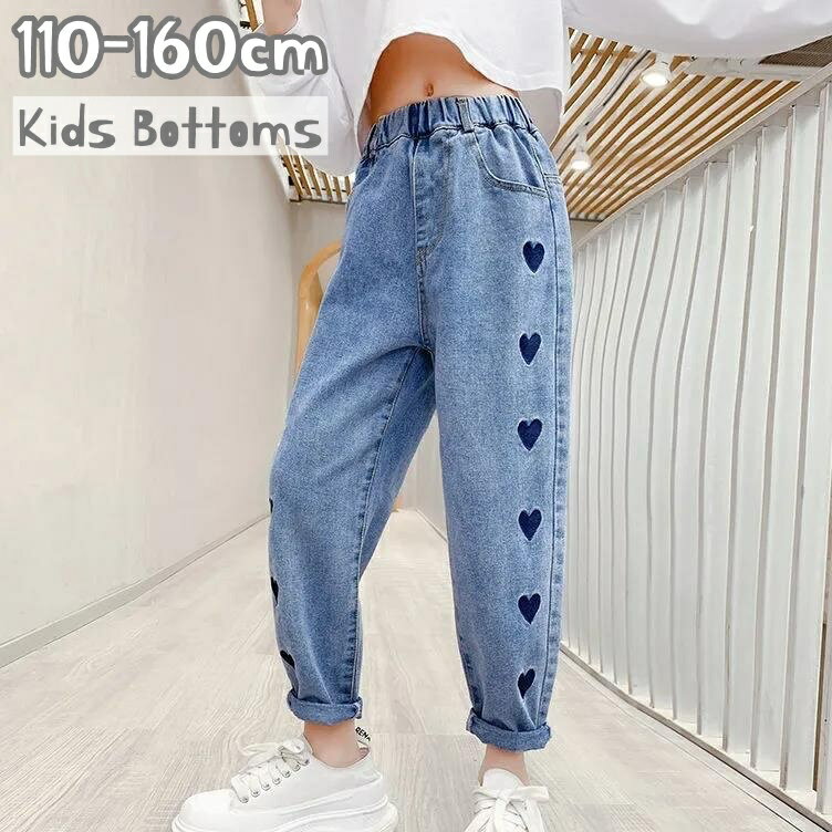 送料無料デニムパンツロングパンツキッズジュニア子供女の子ガールズボトムスジーンズ長ズボンウエストゴムハート110120130140150カジュアルシンプルお洒落お出かけ普段使い子供服160