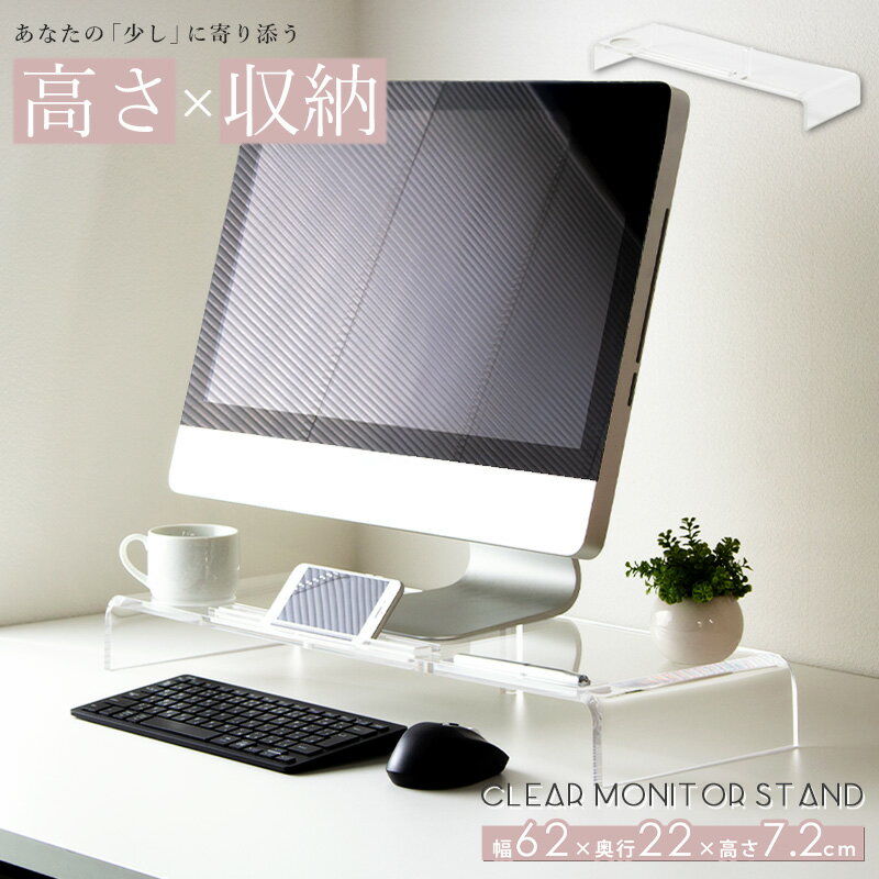 【完成品】 クリアモニタースタンド/幅60cmタイプ ・デスクワーク環境を便利で快適にするモニタースタンド。 ・モニターを浮かせることで、棚下を収納スペースとして有効利用。 ・キーボードやマウスなどの周辺機器やステーショナリー小物を収納できて、机の上がすっきり! ・目線を上げて作業することで、肩や腰への普段を軽減し、長時間の作業でも疲れにくくなります。 ・背板の無いオープンタイプなので、配線もすっきりさせることができます。 ・約幅60cm×奥行20cmのコンパクトなサイズ感で、卓上、机上で場所を取りません。 ・クリアなアクリル素材は、光を透過させることで明るさを演出し、洗練された印象を与えます。 利用場所: リビング 書斎 オフィス SOHO 事務所 デスク周り デスク上 卓上 新生活 一人暮らし 1人暮らし 利用方法: モニターの台 モニター台 モニタースタンド ディスプレイ台 pcモニター台 パソコンモニター台 デスクモニター台 パソコンディスプレイ台 pcディスプレイ台 デスクトップ台 ディスプレイスタンド モニターラック 卓上ラック 机上ラック pcラック ディスプレイ置き台 置台 おすすめポイント: 完成品 組み立て不要 モニター下 ディスプレイ下 キーボード収納 マウス収納 幅60cm 小さめ コンパクト 24インチ 奥行30cm スリム 省スペース 高さ10cm 低め 低い 薄型 2段 二段 高さ調整 木製 木目 白 ホワイト ブラック ナチュラル ブラウン【完成品】 クリアモニタースタンド/26型/幅60cmタイプ その他おすすめアイテム モニタースタンド/幅60cm モニタースタンド/幅80cm モニタースタンド tower/幅60cm 商品名 【完成品】 クリアモニタースタンド/幅60cmタイプ 色 クリア サイズ 本体:幅62×奥行22×高さ7.2cm 重量 約1.7kg 材質 アクリル(10mm厚) 仕様 耐荷重:天板10kg 対応テモニターサイズ目安:〜26V 梱包サイズ:63.5×24×10cm/2.2kg 完成品 生産国:中国 配送について 玄関先お届け 配達日時指定可 備考 沖縄県全域/離島への配送は別途送料が必要です(※送料は当店へご確認ください) リビング用品一覧はこちら トップページへ 【1日はポイント10倍★】 【完成品】 モニター台 モニタースタンド 幅60cm 奥行20cm 高さ7cm 2段 高さ調整 worksモニター台 卓上 24インチ 26インチ パソコンモニター台 works パソコン ディスプレイ台 卓上 アクリル モニター 下 収納 高さ調節 コンパクト クリア works 7,480 円